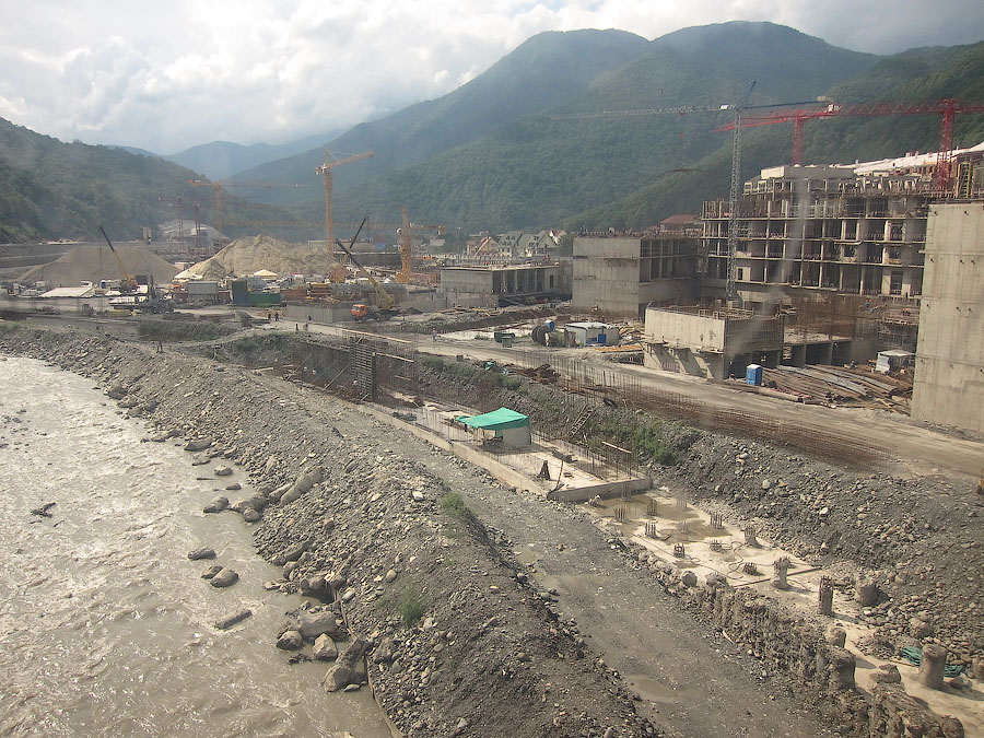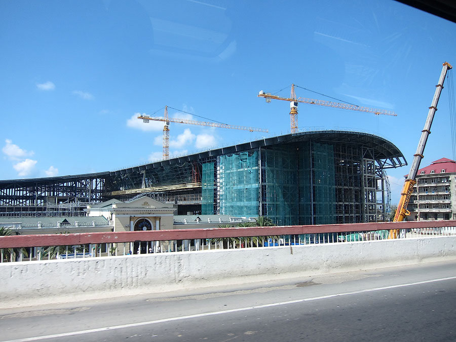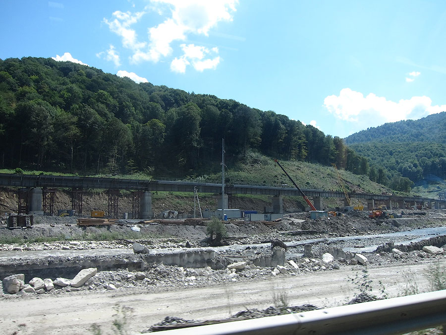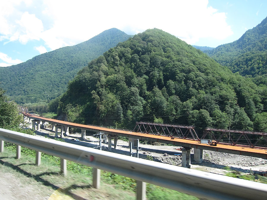 По непосредственной дороге на Красную поляну заметно активное строительство совмещённой автомобильно-железной дороги вдоль русла реки Мзымты. Во всяком случае эстакады и многочисленные балки мостов уже на месте. На многих отрезках установлены опоры КС, дожидается укладки решетка.