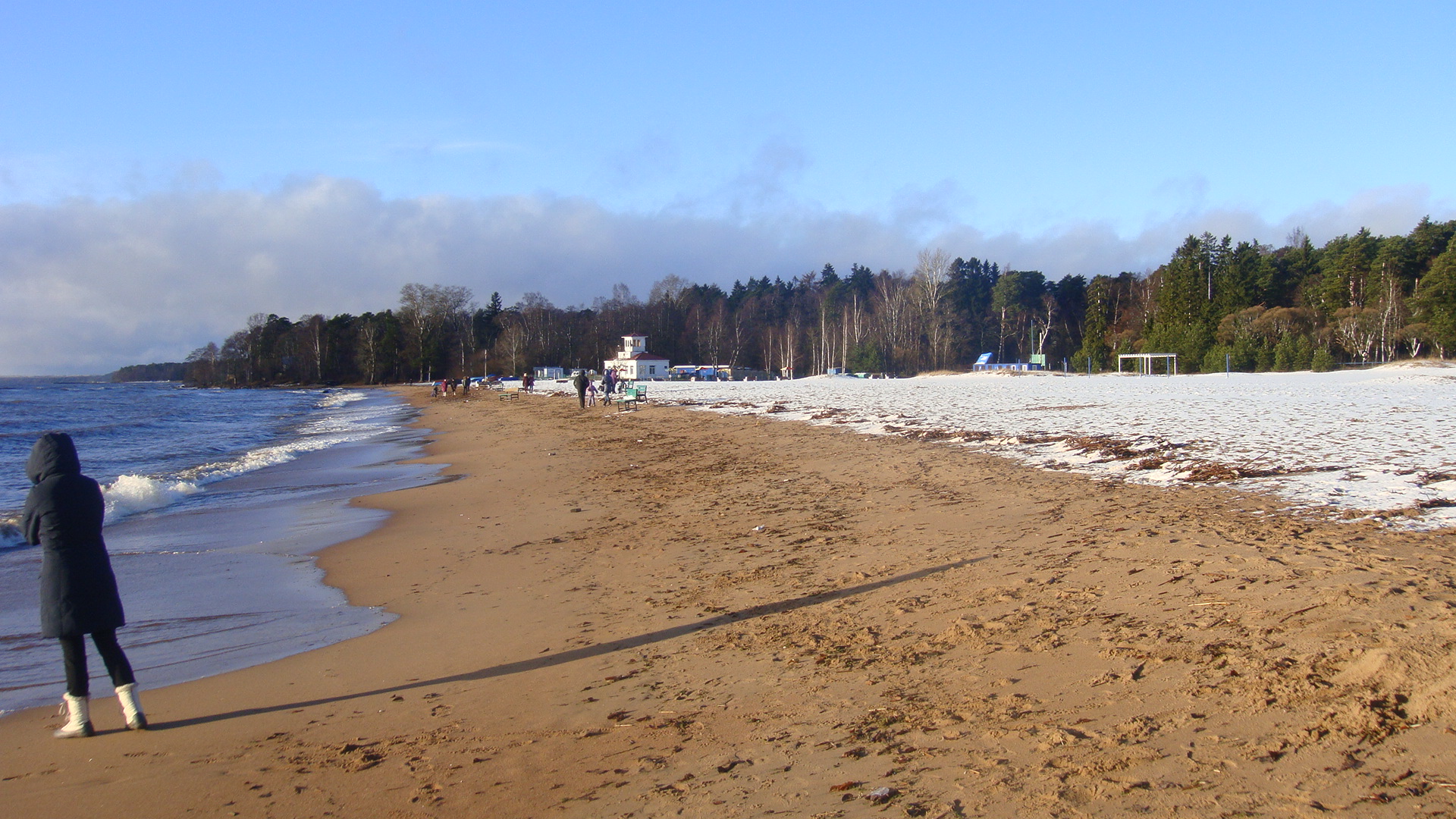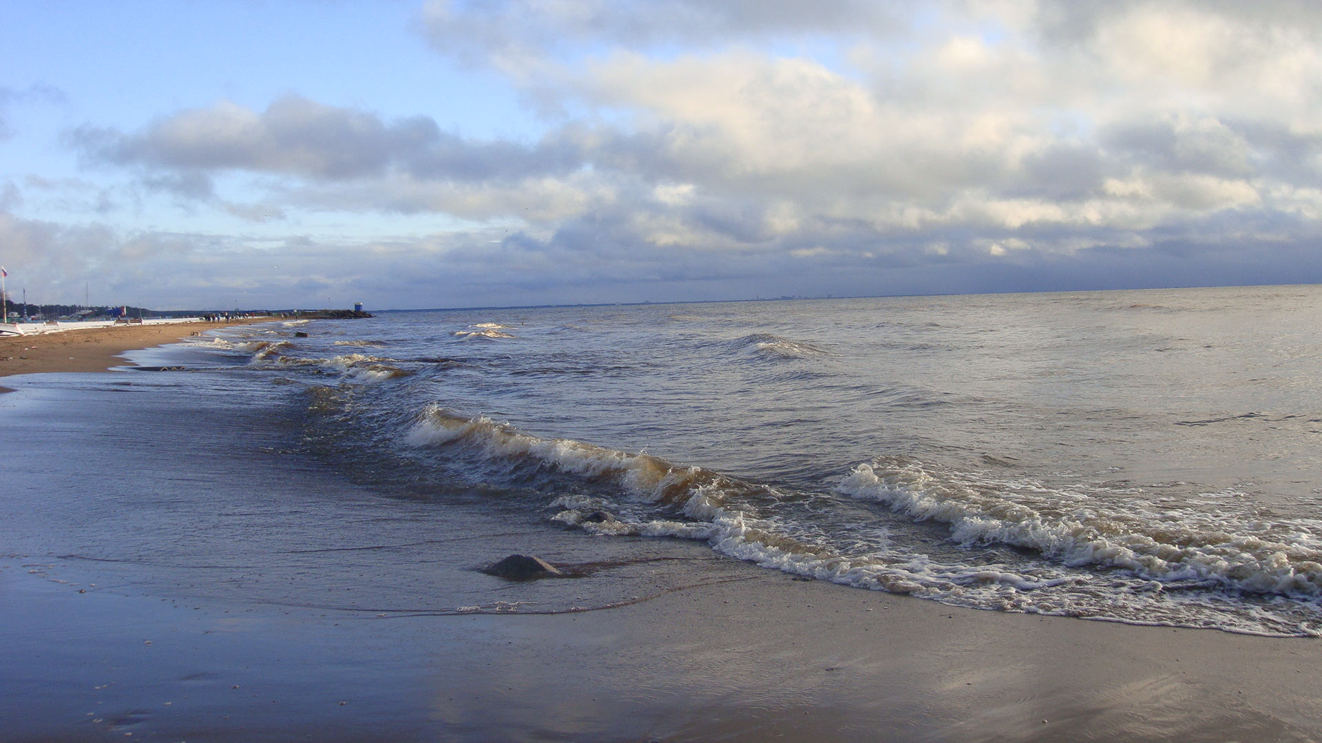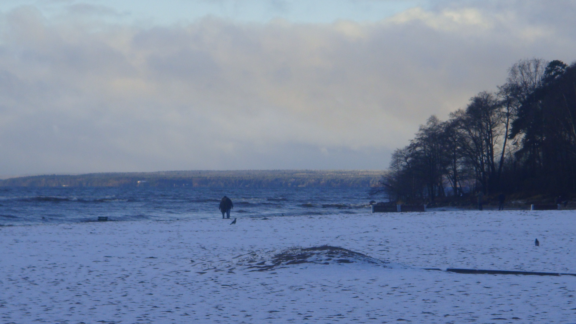 Вода в заливе (по чистоте) имхо приемлема для купания. Не удержался и даже попробовал на вкус ::-D: - совсем слегка солоноватая. У берега мы были минут 20, за это время погода сменялась часто - солнце то выглядывало, то опять скрывалось за многочисленными облаками над горизонтом... По берегу рассыпаны ракушки - честно говоря, всё это было весьма непривычно видеть в ноябре, потому что в своей жизне до этого я видел только летнее море.