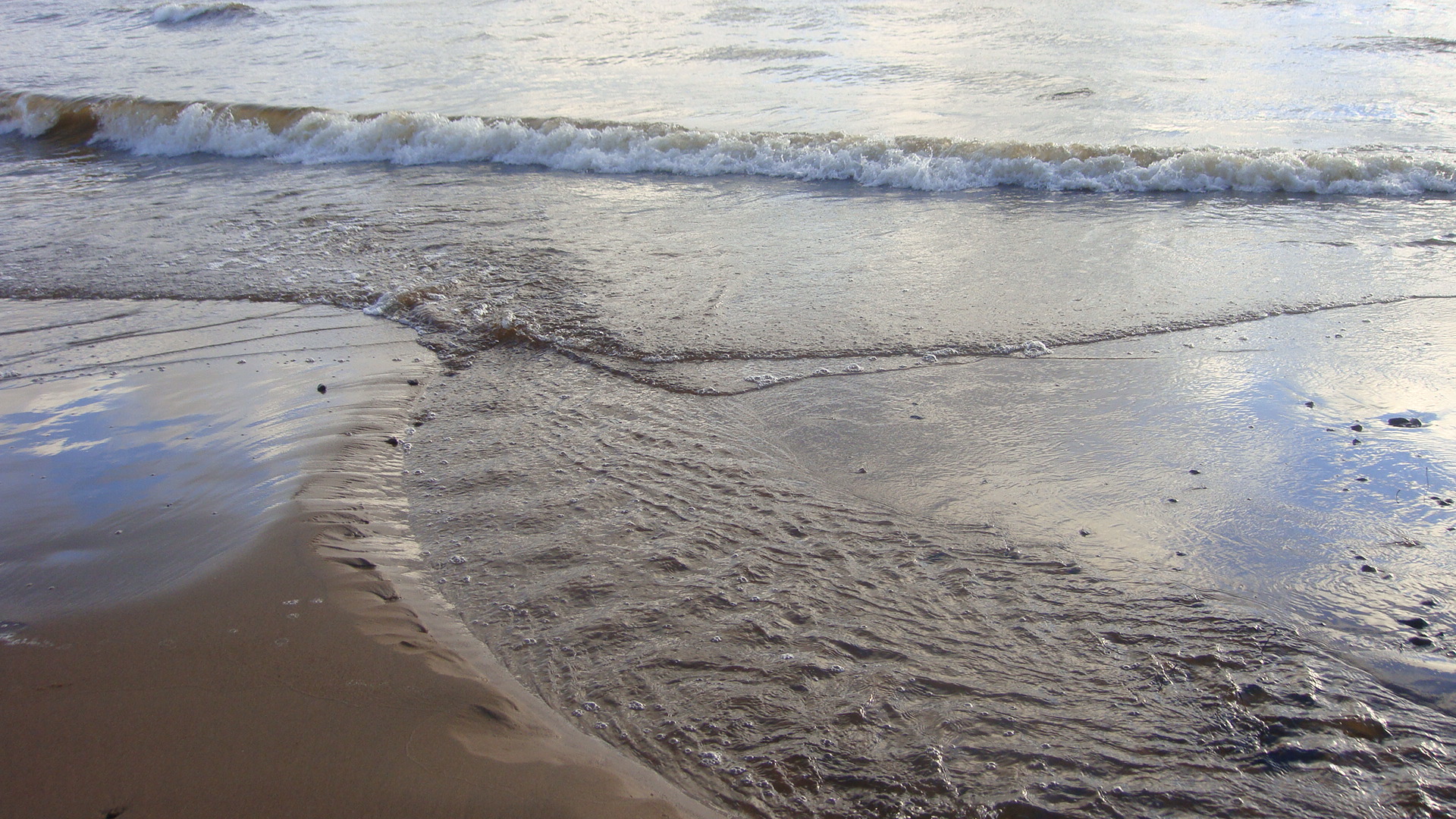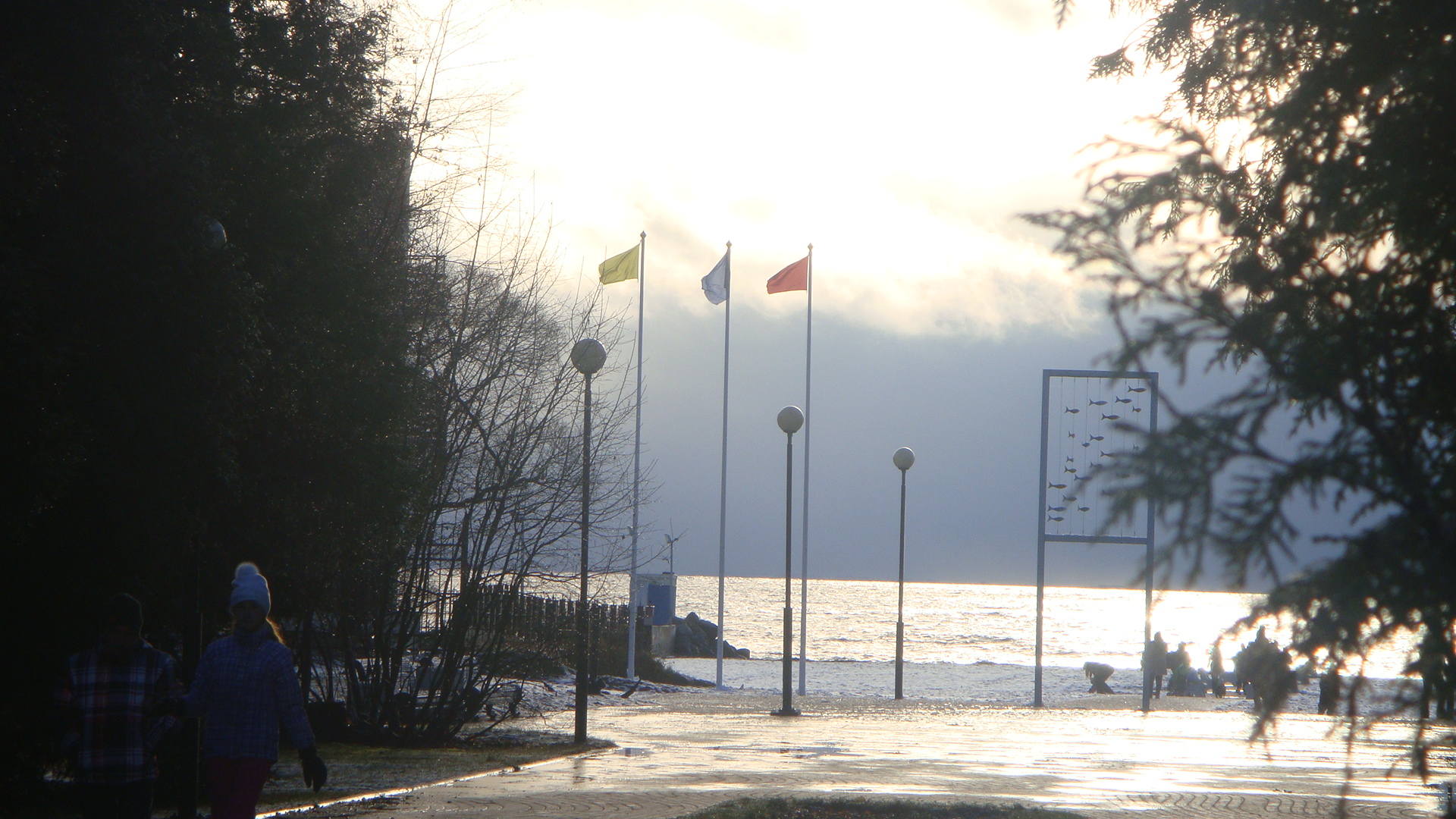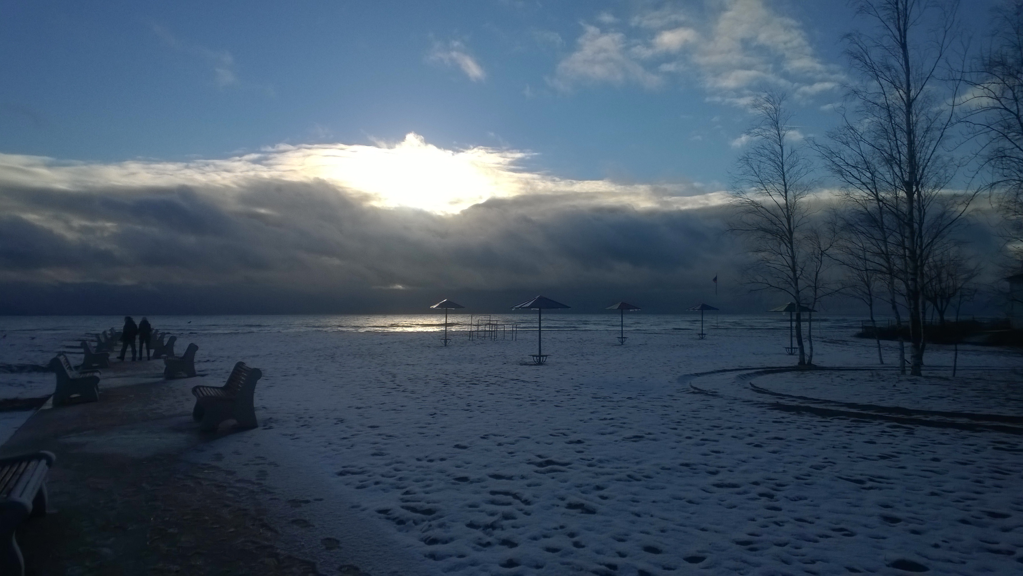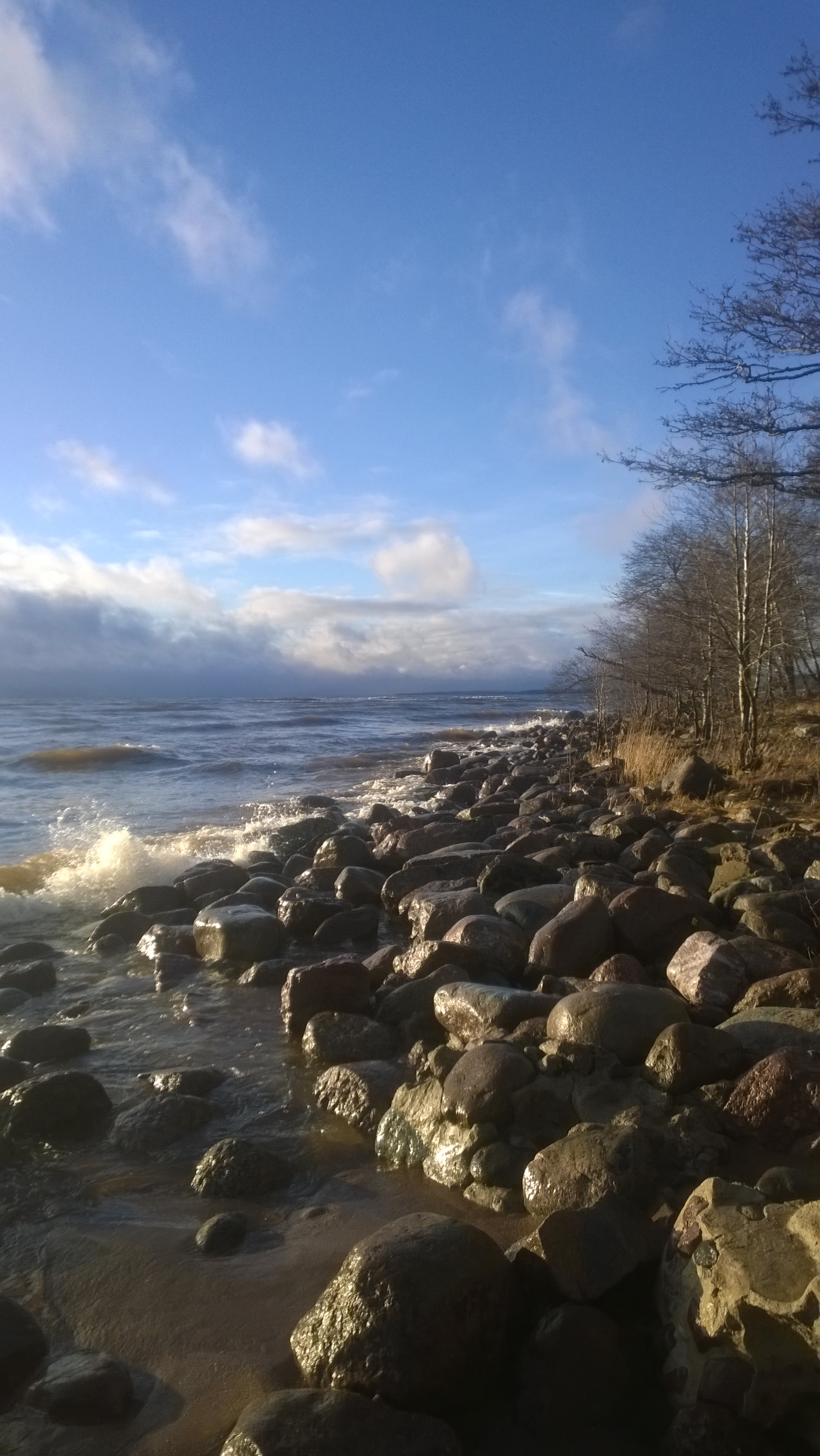 Вода в заливе (по чистоте) имхо приемлема для купания. Не удержался и даже попробовал на вкус ::-D: - совсем слегка солоноватая. У берега мы были минут 20, за это время погода сменялась часто - солнце то выглядывало, то опять скрывалось за многочисленными облаками над горизонтом... По берегу рассыпаны ракушки - честно говоря, всё это было весьма непривычно видеть в ноябре, потому что в своей жизне до этого я видел только летнее море.