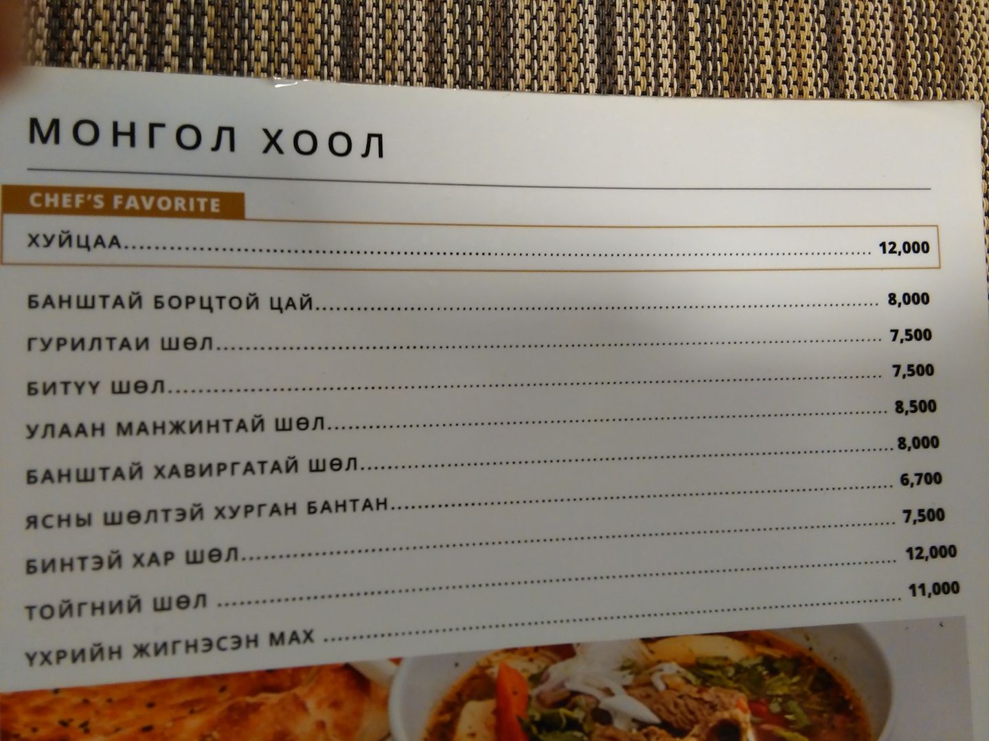 Скажу пару слов о еде. Улан-Батор благоприятное место для еды. Без глобализации здесь не обошлось, поэтому кухня самая разнообразная. Особенно популярна, судя по количеству заведений, корейская. Европейской тоже хватает, была даже Украинская, которую посещали в первый день. Цены высокими не назовёшь, классический бизнес-ланч можно взять за 5000 тугриков (160 рублей). За эту цену получите тарелку супа, "Цуйван"/несколько поз/монгольский чебурек ("хушуур"), два маленьких салата, булочку и кружку традиционного чая с молоком и солью. "Цуйван" - одно из самых популярных блюд, представляет из себя лапшу с фаршем и овощами, довольно сытно. Хушуур от российского чебурека отличается большой жирностью и сочностью. Суп нас очень заинтриговал. Задолго до того, как мы его попробовали, увидели в меню одного дорогого ресторана (где есть не собирались):