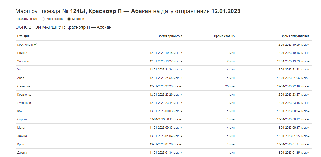Ага! А вот расписание 124-го поезда Красноярск - Абакан. Тоже "счастье" для проводника. Считается скорым, кстати.БАРСИК: Посмотрел на его расписание. Это ж проводнику можно из тамбура не уходить!