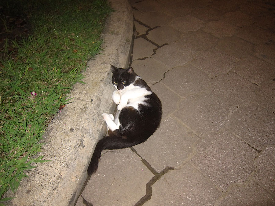 Местный кот-паршивец. Нанюхался в клумбах каких-то ароматов, затем катался на спине ::-):