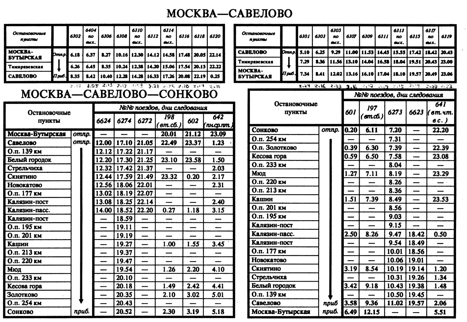 Кстати, прилагаю еще одну историческую инфу: расписание Савелово - Сонково из издания ОКТ ЖД "Справочник пассажира" от августа 1997 г. Питерский 198/197 еще есть, а, вот Москва - Углич уже нет. Вместо него уже "сборная солянка" 642/641. Да, 6272, разумеется, уже тоже не в ходу, но "О.Н." приписать забыли.