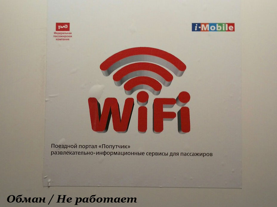 Висит нашлёпка в купе "Wi-Fi " (местная сеть какая-то - "Попутчик") , не работает. Утром спросил у начальницы поезда , говорит, ещё не подключен, якобы только провели. Наврала, конечно. Стикер этот такой же древний как и вагон.