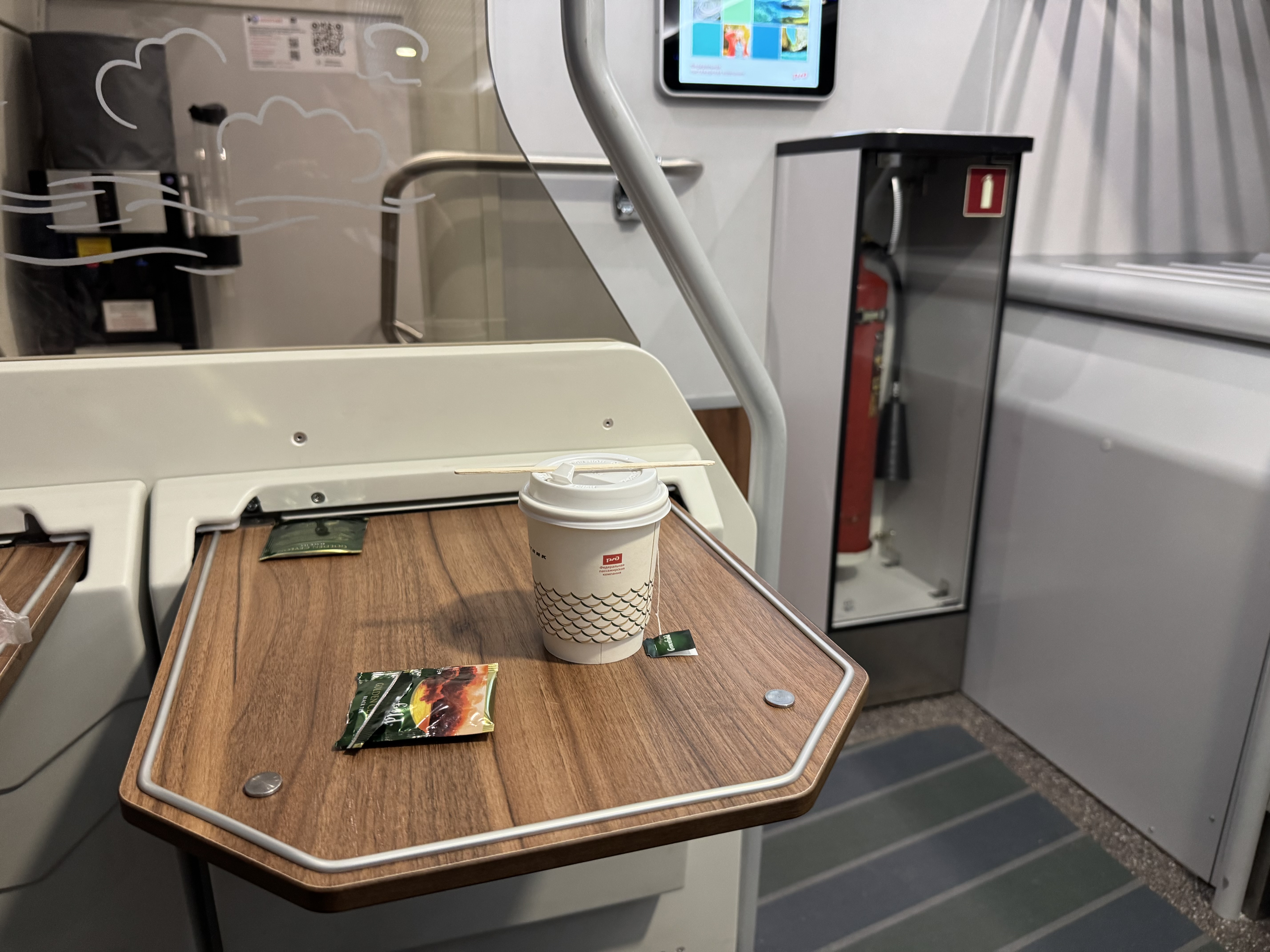 Кипяток (градусов 70) бесплатно в пластиковом стакане; вместо ложки - деревянная палочка, чай у меня свой -