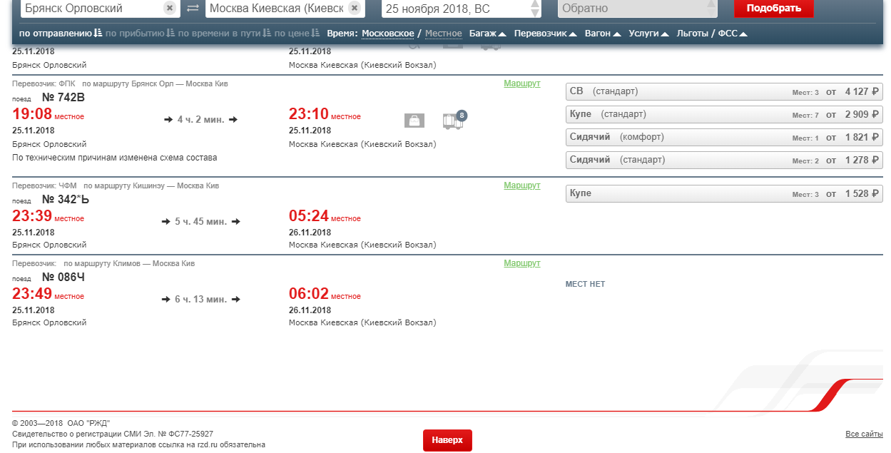 Пустой он идет - на завтра около 200 мест пустых и это в ВСК при прибытии в ПОНЕДЕЛЬНИКFhctybq: Только на Москву практически всегда 086 идет практически всегда полный, вот и ответ, нужен ночник или нет. Дневники ранее прибытие никак не смогут сделать, в отличии от ночного поезда. И опять же дневные поезда не могут быть заменой ночников. Не всем нужно прибытие к обеду!