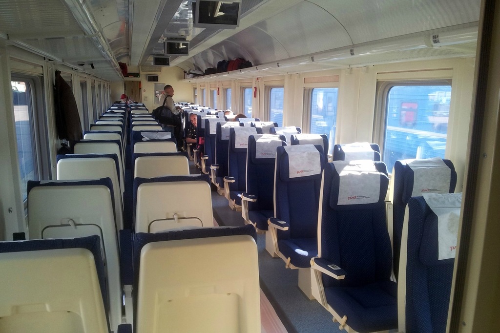 Надо было взять билет в самый пустой вагон, если время и дата не пиковая, то пересесть на свободные места по ходу движения. Дермантин и тканевая обивка это тоже на любителя. Ткань приятнее. В 1С классе просто кресла чуть шире и подлокотники с каждой стороны.