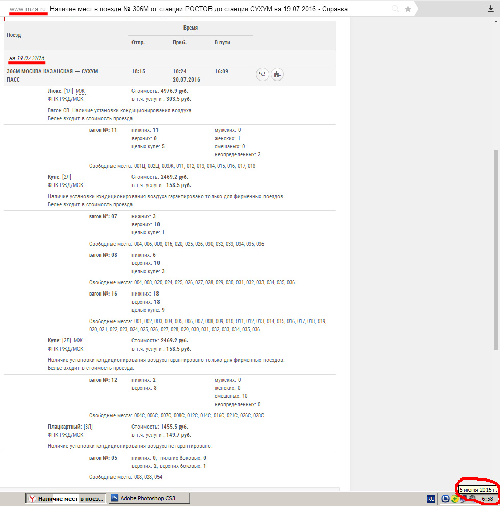 ДА УЖ :*SORRY*: ...купила я сегодня билеты на 18.07....но не ожидала ,что из Ростова в "ту-ту "будет всего 4 нижних места в плацкарте возле туалета :=-O: Причём мне их так и не дали ::-D: Забила я их в 8-00,а система мне выдала (пока я оплачивала),что этих мест уже нет...ну естесс-но уже и никаких не было... Еле успела в купе взять )и тоже странности какие то: "забила"их,нажала оплатить и опять на выходе: ЭТИХ МЕСТ УЖЕ НЕТ,выберите другие :=-O: чуть инфаркт с утра не получила :@=: думала вообще без билетов останусь...Постоянно беру на ту-ту билеты и такого не разу не было,чтоб выбранные и "забитые" места уводили из подноса :8-): но всё таки удалось выцепить 2 билета в 9 вагон...если будет 1-й состав,то должен быть вагон приличный тв3 трансформер с ЭЧТК ,а если второй,то если я правильно разглядела на видео,то это тв3 2000г а значит без биотуалета ::-(: Была даже мысль перекладными ехать ,но получается,что бегая по плацкартам выходит по цене на 300руб дешевле чем одним составом в купе в 306.