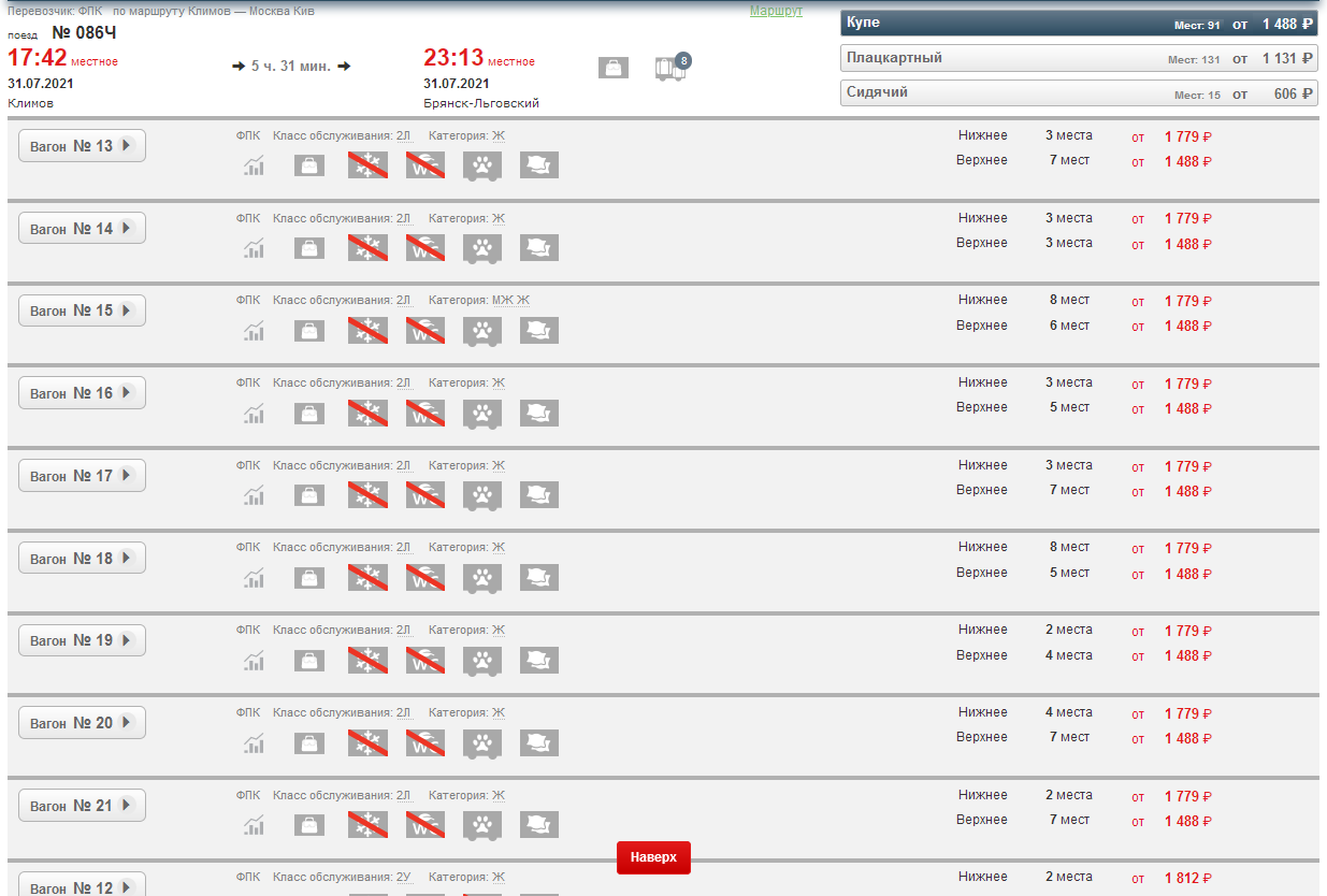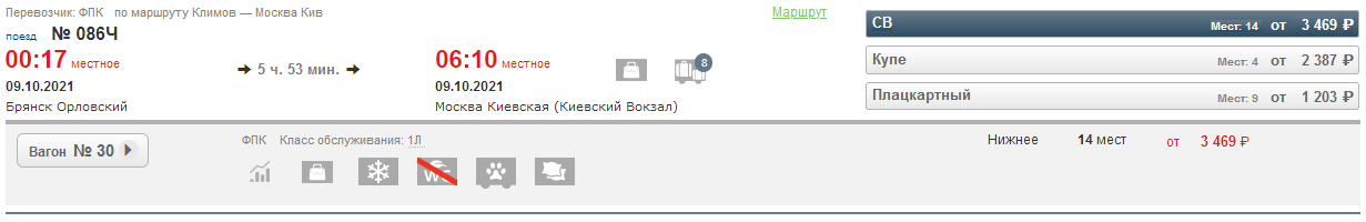 Опять двадцать пять! Мест на 86, на сегодня, на Москву нет ни одного! И это, кстати, далеко не впервые, даже за последние несколько недель. И это пятница, на Москву, а не из. Остались, как обычно, только брянские прицепки, докуда надо ещё как-то добраться. Когда все тридцатые вагоны в августе-сентябре вместо Брянска ходили на полный маршрут, нехватка мест хоть не так остро ощущалась. В Брянске, кстати, на этот раз даже второй СВ вцепляют.