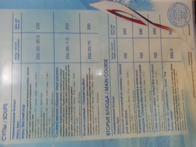 7 ноября прошлого года. Я даже специально переспрашивал официантку. Хотя может я заказывал что-то такое, что было исключением, и официантка ответила именно про это. Все равно потратил я точно 800 с чем-то, и мясо тоже брал. Вот есть одно фото того меню. Можно ли по нему меня опровергнуть?serg:А когда вы ехали? Может во времена, когда состав обслуживался не СКЖД? Просто цена за 100 грамм - это отличительная особенность всех вагонов-ресторанов СКЖД. Хотя допускаю, что для этого поезда решили сделать исключение, дабы избежать скандалов и негатива на высоком уровне.