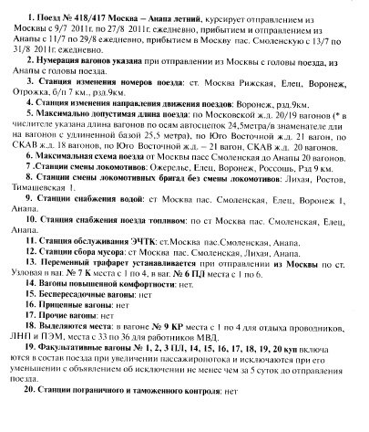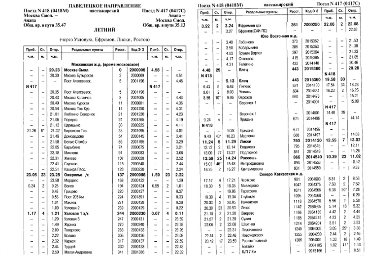 Возвращаясь к сабжу: Нет ли у кого выдержки из служебки по данному поезду? Интересно, что в сторону Анапы он идет через Придачу, а обратно - через Воронеж-1 и со сменой направления. Интересует выдержка по нумерации вагонов. Перевешивают ли ему таблички по пунктам оборота? Получается в теории, что он идет головой вперед, обратно - до Воронежа хвостом вперед, после - головой вперед. И тот же рейс из Москвы идет хвостом на Анапу? Пожалуйста, разъясните ситуацию. Спасибо.