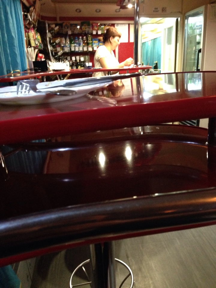 - я обнаружил там мужчину, орущего дурниной, что его обманули и пытавшегося извлечь официантку с кухни, где она пряталась. Было любопытно наблюдать, как он пытается пролезть в раздаточное окно кухни и выцепить оттуда официантку - почему-то он не мог догадаться, что через дверь в тамбуре это будет сделать проще... Увидев бесполезность своих попыток он ушел к себе в вагон, после чего официантка вернулась в зал. Судя по последовавшему диалогу официантки с парнем: