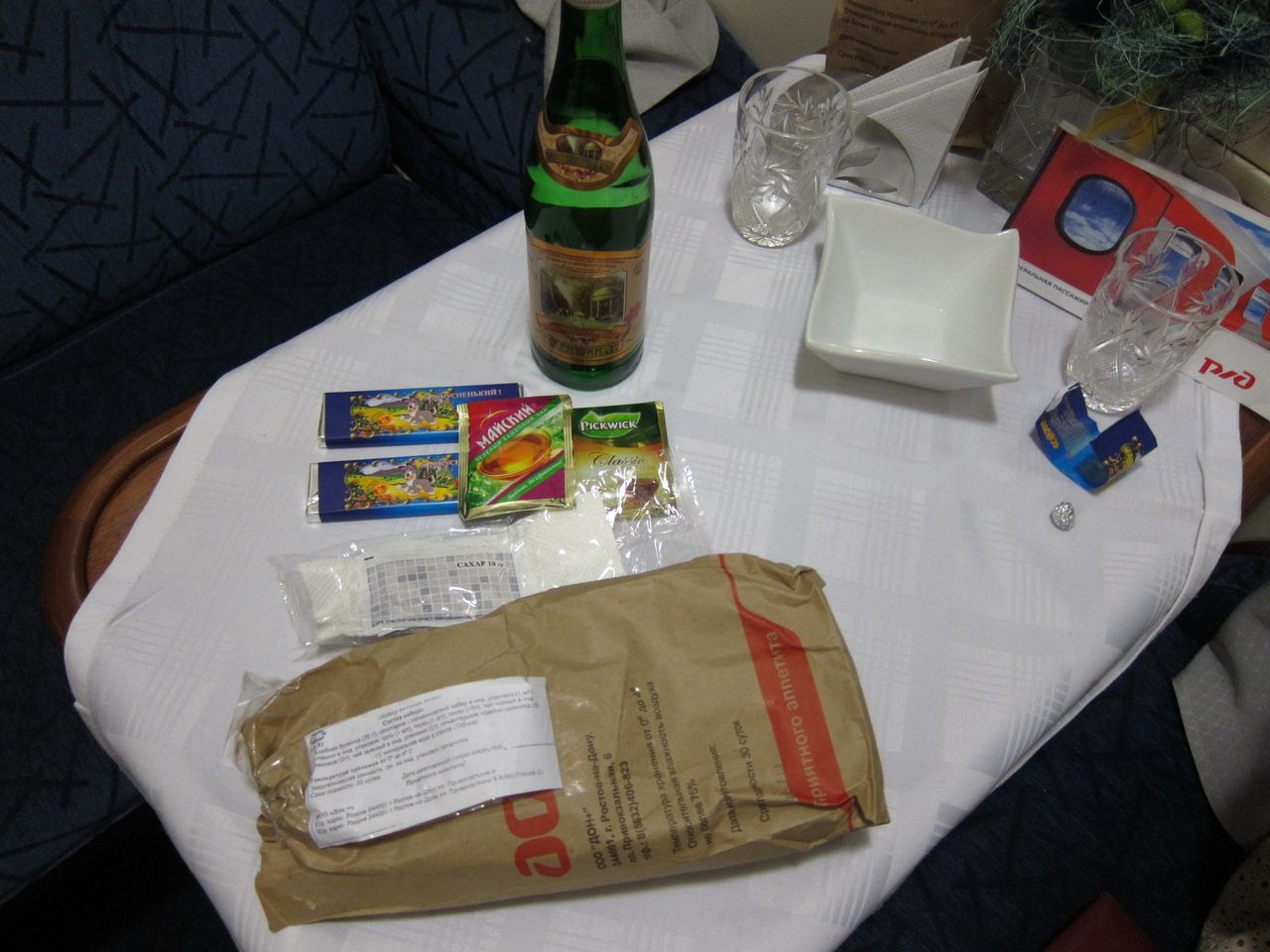 По обслуживанию. Две проводницы за 40, в меру любезны. Осведомляются о знакомстве с оборудованием купе, рассказывают, показывают при необходимости. Сразу же по отправлении появилась девушка из ресторана с вопросом, какой из предложенных трех вариантов горячего питания (приведены на фотографиях выше) принести. В данной ситуации разум, склонявший не принимать ужин из трех блюд, вступил в жестокий конфикт с совестью, настаивавшей на необходимости воспользоваться оплаченными услугами. Компромисс был найден в виде одного второго блюда, зафиксированного на фото, и сока, доставленных примерно через 45 минут после отправления. От настойчиво предлагаемых официанткой пирожков пришлось отбиваться. Кроме информационного буклета и информации про предлагаемые на выбор рационы горячего питания в купе имеется и полный вариант ресторанного меню с возможностью дозаказа за отдельную плату. Запакованный сухпай (также зафиксирован на фото) по отправлении уже дожидался на столе. Услуги в билете У1, но выдаются рационы питания для двоих человек. Использованную посуду забирает проводник, вызываемый по кнопке. Также проводница осведомилась о времени побудки.
