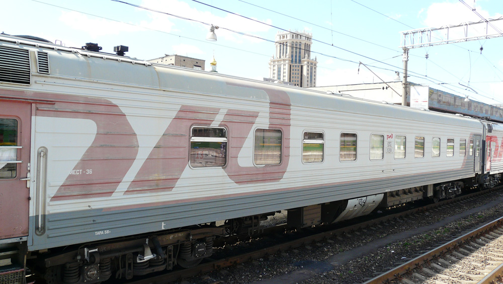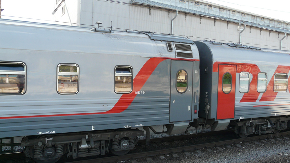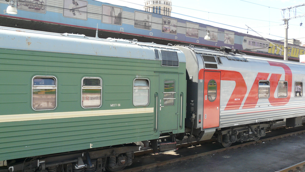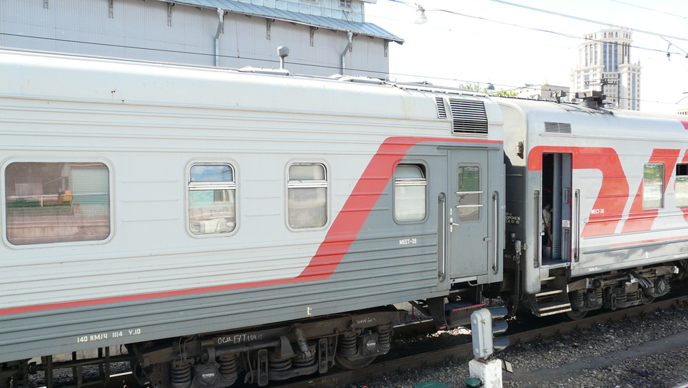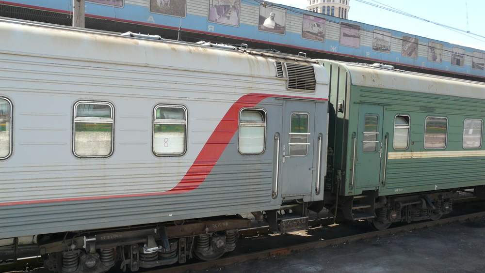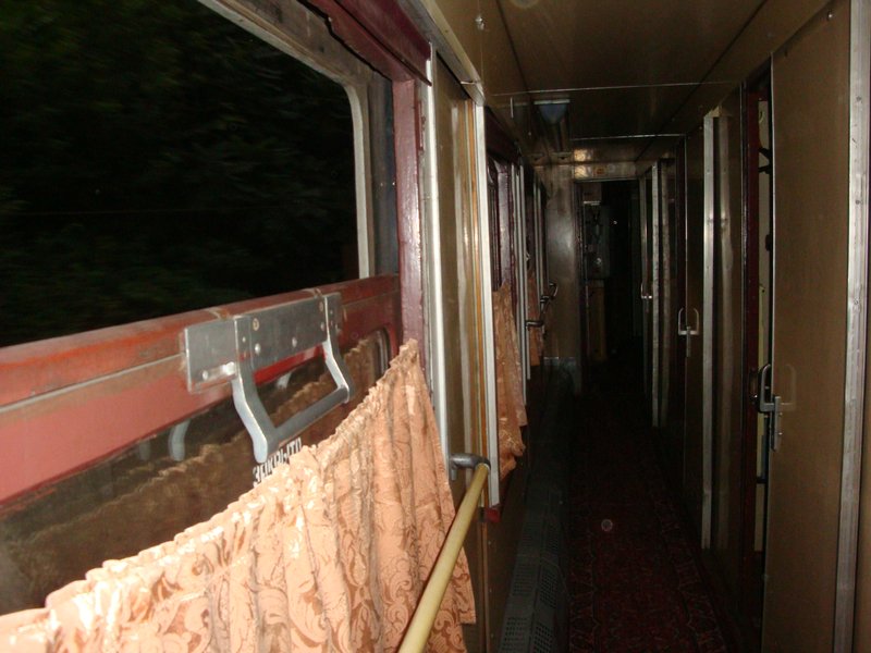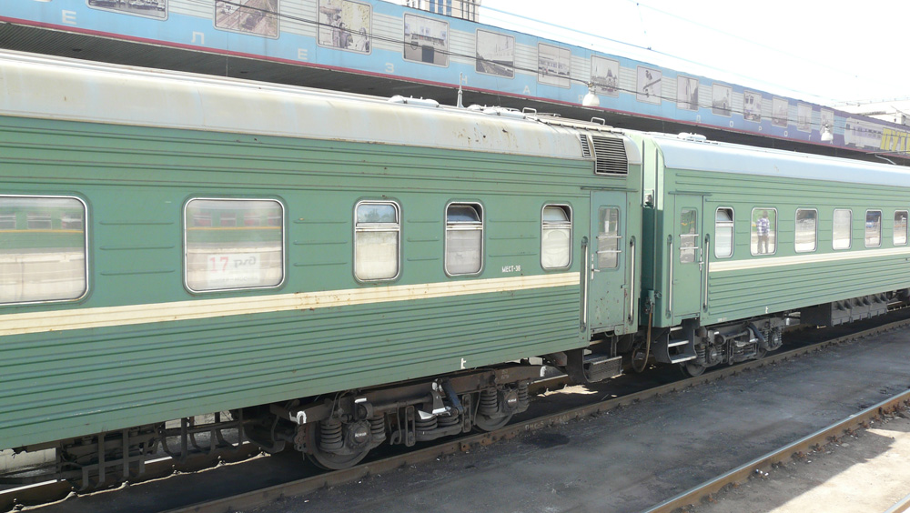 Я ехал в первом вагоне, он выглядел внешне хуже всех, это был обычный КВЗ с деревянными рамами. Серая краска смотрелась убого, кое-где уже пооблуплялась. Интересно, что вагон судя по номеру 004 21883 принадлежит Октябрьской дороге, все остальные вагоны СКЖД. Другой плацкартник был тверской первых новых серий, со стеклопакетами, купейные - Аммендорфы.