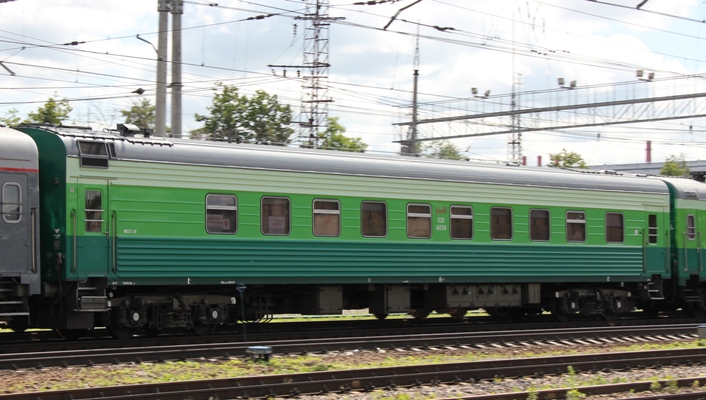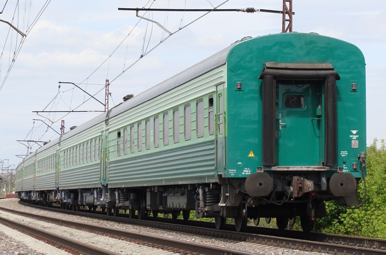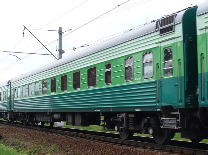 Купейный вагон в фирменной раскраске Тургенева. Снято летом 2010 года.