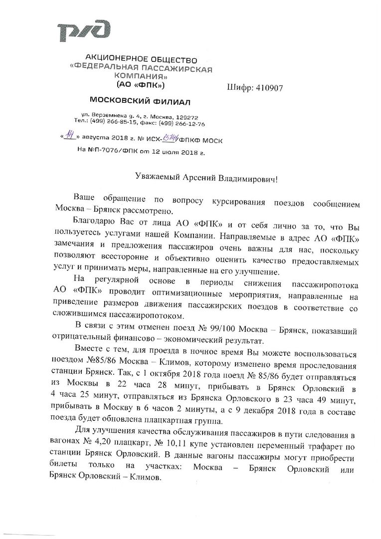 Пришел ответ, при этом писал обращение, когда еще измененного графика 085Ч не было известно. Написали то, что и так все на форуме знают. И 4 вагона из 23 будут с трафаретом по станции Брянск Орловский, то есть они от Брянска до Климова и от Климова до Брянска пойдут пустыми, что-то я слабо представляю, что кто-то будет покупать билет на поезд от Брянска до Климова с отправлением в 5 утра, когда он может поехать на автовокзал позднее и приехать на автобусе или маршрутке одновременно с поездом. Как и от Климова до Брянска с прибытием в 23:20-23:30 Лучше бы сделали 4-5 прицепных вагонов, как и планировалось в свое время, Брянск-Москва, а Москва-Климов оставить в 18-20 вагонов. И поработать со временем прибытия в Брянск, на Москву можно поставить с прибытием в 06:40. И все же не понятно с нового графика стоянка 45 минут, неужели думают, что за 30 минут посадку нельзя будет осуществить?