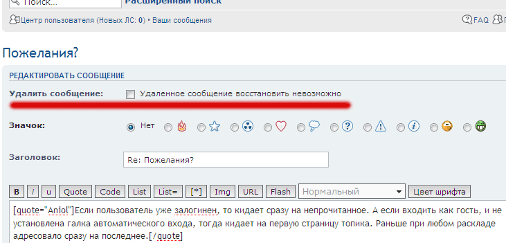 я когда писал то сообщение, даже и кнопки редактирования не было. сейчас есть, но кнопки "удалить" (если войти в режим редактирования) я всё равно не вижуАдминистратор:Заходите в редактирование, первый чекбокс: "Удалить сообщение:" у Вас виден?Фыва Цукен:кстати, а что - я не могу удалять свои сообщения? а то решил было удалить, а кнопки не нашёл...