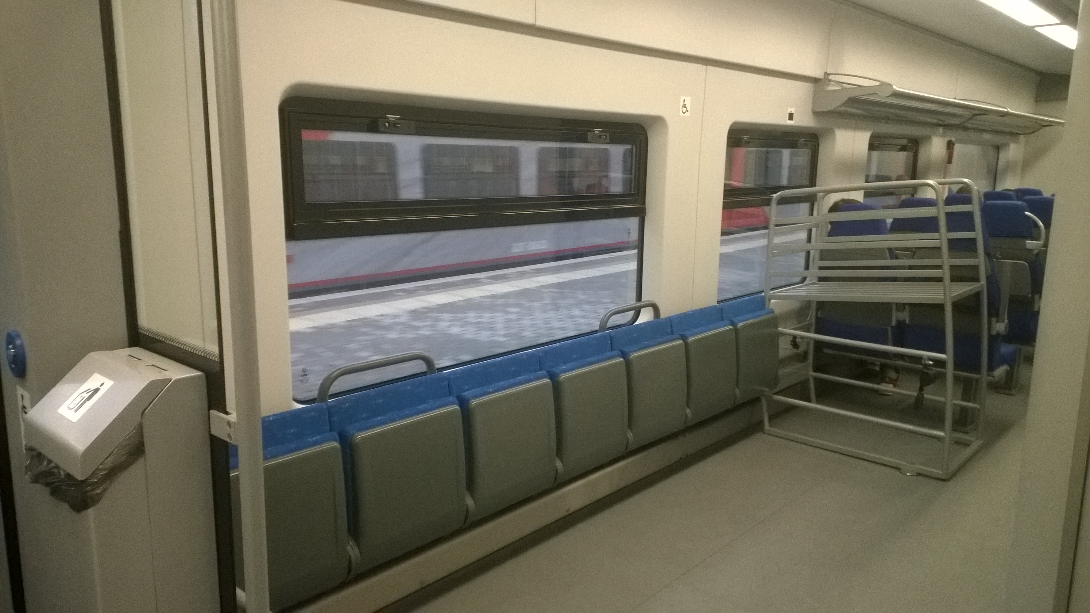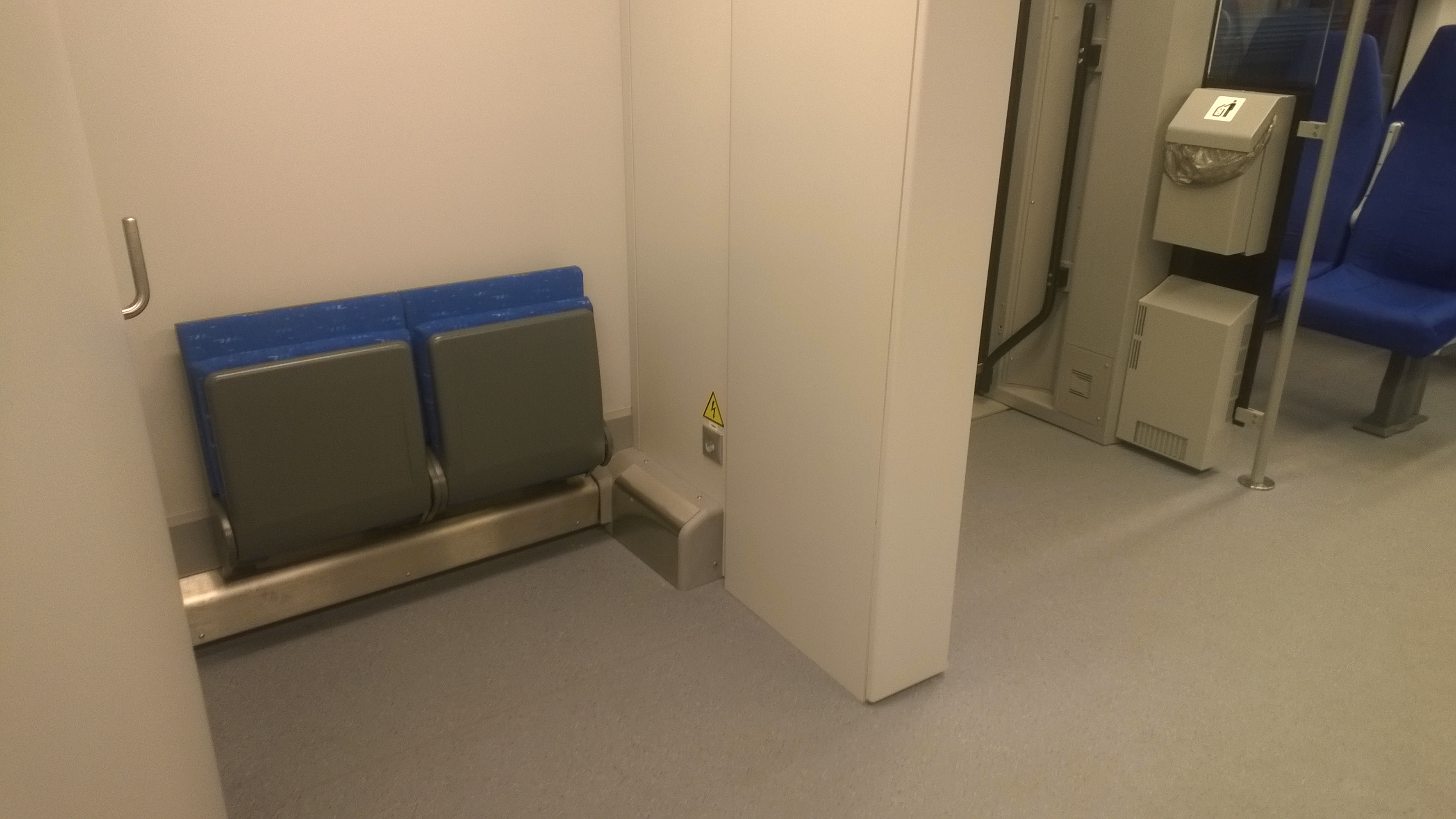 Напротив туалетов (которых две штуки на состав - в головных вагонах) располагаются откидные места - на них при мне ехали охранники. Сидения откидушек мягкие, со спинками.
