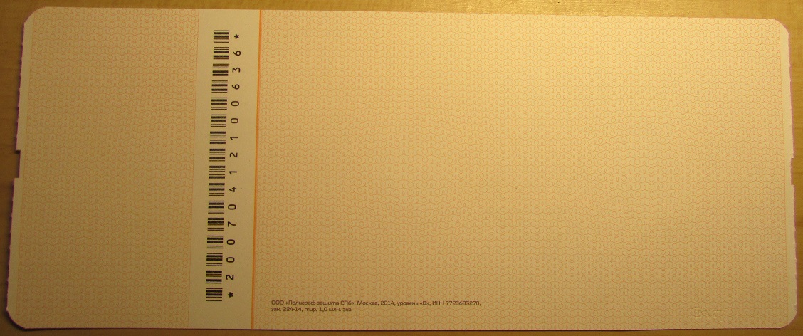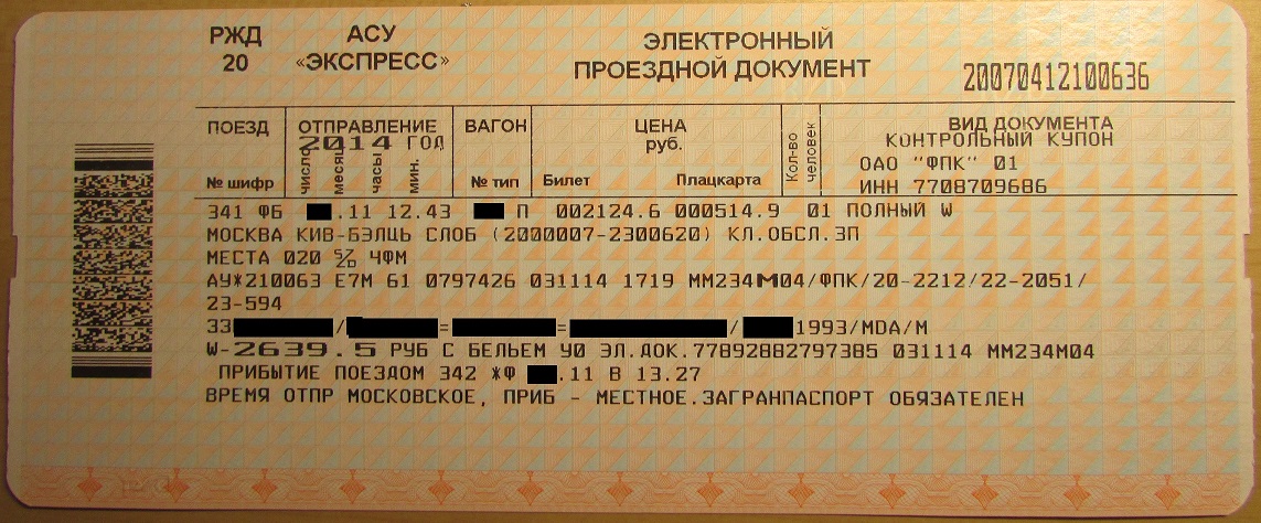 Вчера купил в ТТС на вокзале ст. Мытищи такой билет. Узорчатая сетка на лицевой стороне - как на купонах билетов РЖД в международном сообщении и на билетах ж.д. некоторых государств. Как я понял из найденной на сайте РЖД-Партнёр новости, билет на таком бланке остаётся у проводника в течение всей поездки пассажира, а перед прибытием на станцию назначения возвращается пассажиру (как было в период действия системы "Экспресс-2" до введения трёхслойных билетов "Экспресс-3", т.е. до 2000 г.). Возникает вопрос: а как проводник вагона будет отчитываться за использованное пассажиром постельное бельё, которое было включено в стоимость билета, ведь билет он обязан вернуть пассажиру ? Неужели в бельевую кладовую депо будет приходить выписка напрямую из системы "Экспресс-3" ? Особенно интересуют поезда формирования стран СНГ, ведь в некоторых из них (в частности, в молдавских) пока ещё нет даже услуги электронной регистрации.