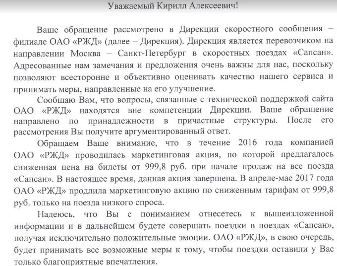 Пожаловался в РЖД на лежащий сайт в 8 утра и невозможность купить билет по минимальной цене. Ну из ответа вы сами можете сделать выводы.