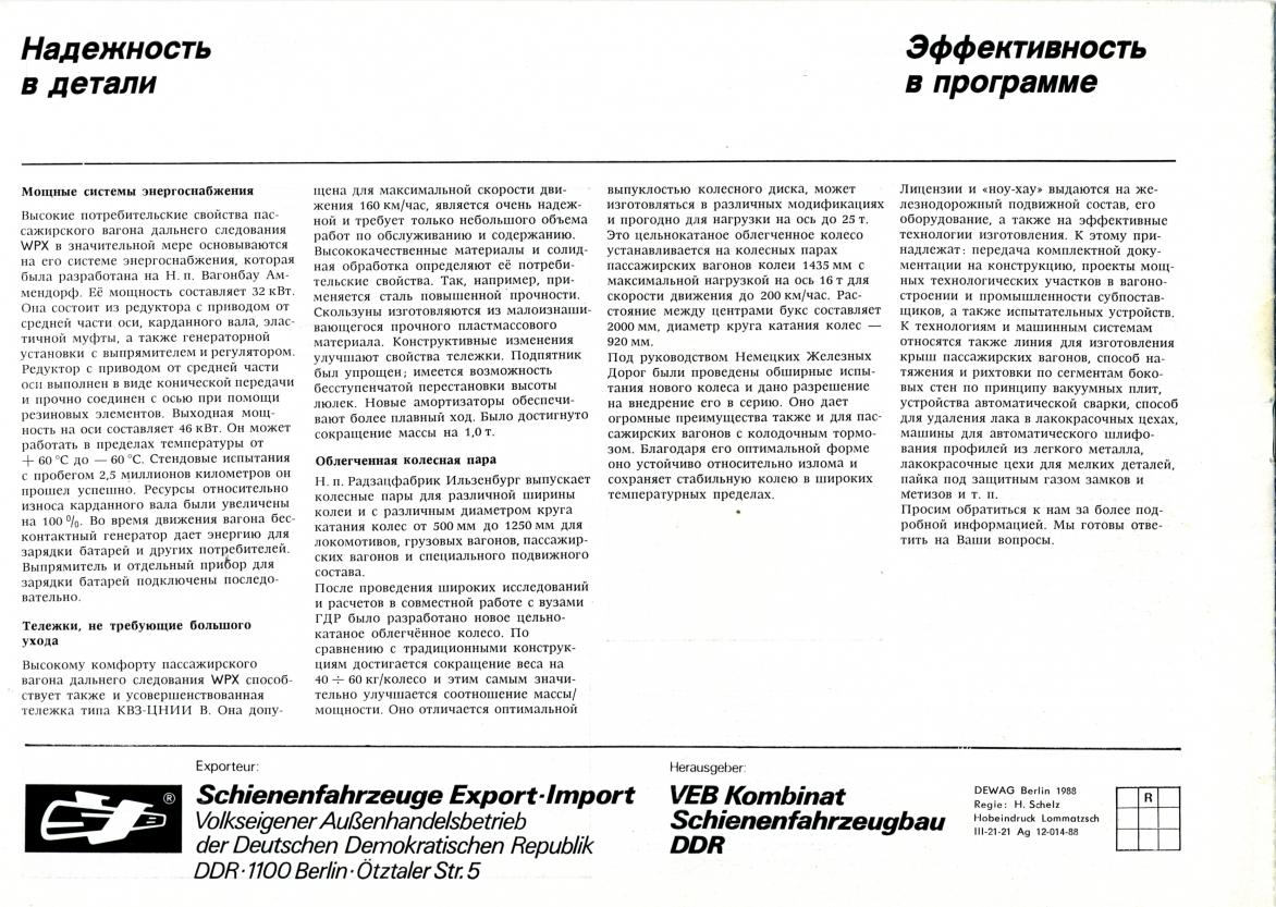 Буклет VEB Kombinat Schienenfahrzeugbau DDR, 1988 год (на русском). Пишут в т.ч. про вагон модели WPX/K.