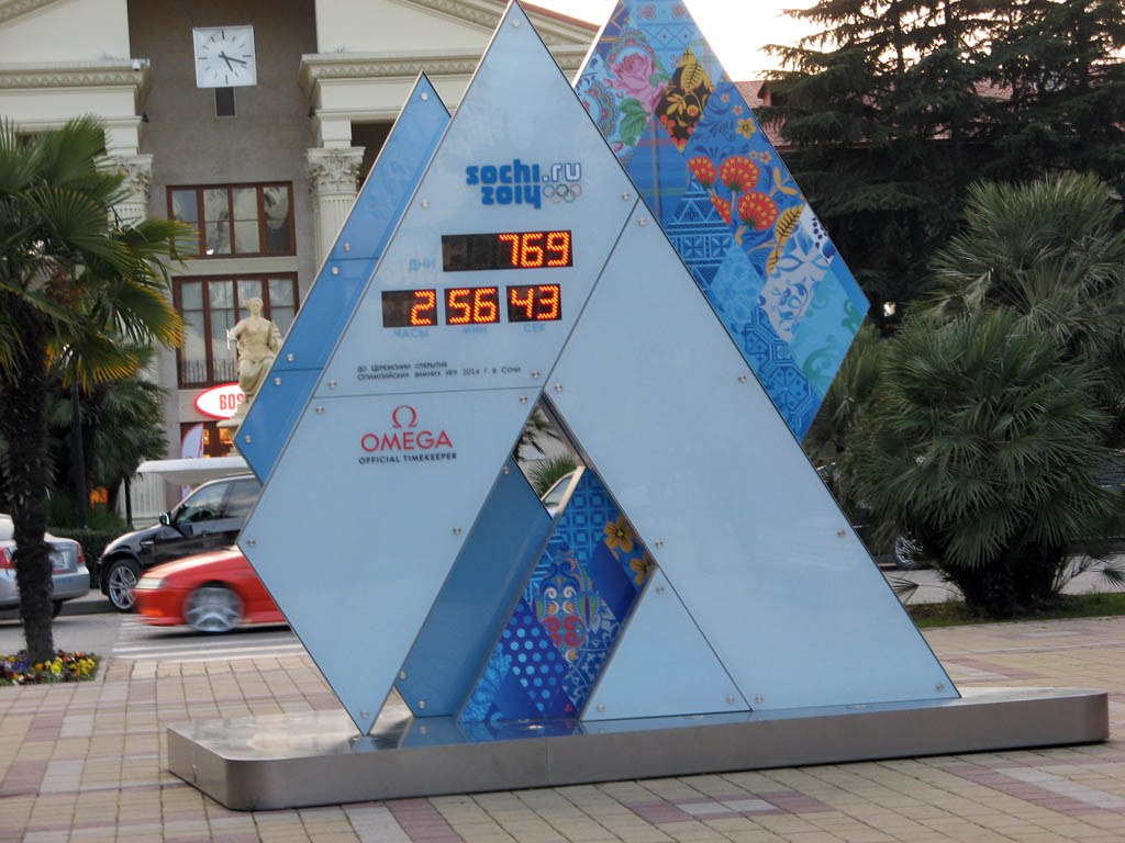 Slon:Самое интересное, что в этот раз вы промахнулись ::-D: мой глазастый ребенок заметил, что вы сняли монумент не с той стороны - это относится не к самой Олимпиаде, а к Паралимпиаде. Фото со сроками про саму Олимпиаду включит не отель "Москва" вдали, а морвокзал, то бишь с другой стороны.
