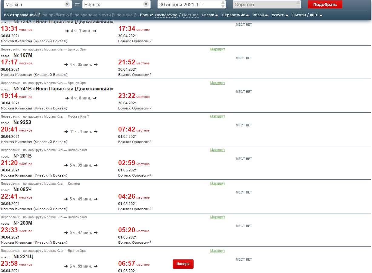 Так кто же знал, что в прошлую пятницу объявят длинные выходные. Вагоны надо достать с баз запаса, экипировать, людей найти в качестве проводников. Такие вещи планируются за месяц, ну на худой конец за две недели.balberov: Все три великолукских из спб на 30 апреля разобрали (почти, остались крохи). А из Москвы на то же направление билеты кончились за 2 недели, и ничего добавлено не было.