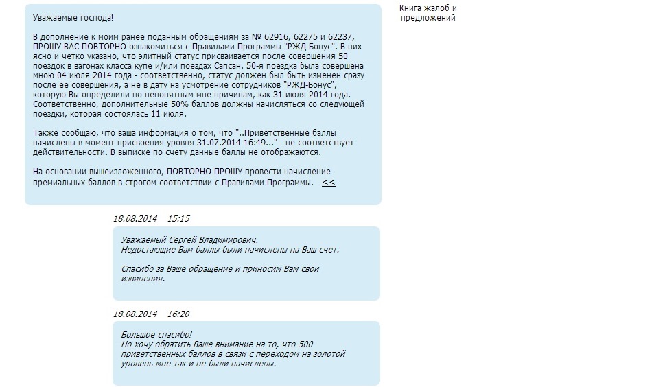 Игорь, а вы давно с ними общались? Повторюсь, что такой резкий крен наступает с сентября, а сейчас - пожалуйста, бери хоть в ФПК, хоть в ТКС. Я и сам помню времена, когда нельзя было и когда не начислялись баллы за поездку в ТКС. Только тогда в 009 ходило не 2 купейных ФПКшных вагона. И что за новый класс 2У - описание невнятное на сайте, есть 2У базовый - где кондюки не гарантированы. Их что выпилят из поезда? Или включать не будут)) . Короче пока вопросов больше чем ответов. Отправил свои реквизиты к вопросу в ЕИСЦ, ждать до 30 днейIgor K.:По 009 саратовскому общался и с техподдержкой РЖД-сайта, и с техподдержкой бонуса. В РЖД сказали, что они ни при чём и что всем ведают те, кто бонусами занимаются, а там просто сказали, что на вагоны ТКС, пусть и взятые в аренду, программа продажи бонусных билетов не распространяется. На вопрос почему, ведь они по ФПК-ным правилам ездят и правила продажи билетов, цены на них ФПК-ные вполне мне ответили, что просто потому, что им так хочется. Я дальше бодаться не стал, т.к. из-за распространения динамического ценообразования на саратовские поезда теперь и в 009, и в 017 практически всегда полно свободных мест и проблем с покупкой бонусных билетов в чисто ФПК-ные вагоны никаких.dma164: Обнаружил новую фишку. С 1 сентября 2015 года в фирменных поездах 009 Саратов-Москва и 001 Волгоград-Москва класс обслуживания в купейных вагонах ФПК/Т стали маркировать как 2У, кроме того, в них стало невозможно купить билет на баллы по программе привилегий, чисто ФПКшных осталось 2 вагона-купе на весь состав + плацкарты (в 009). Кто может прокомментировать данный неприятный факт?