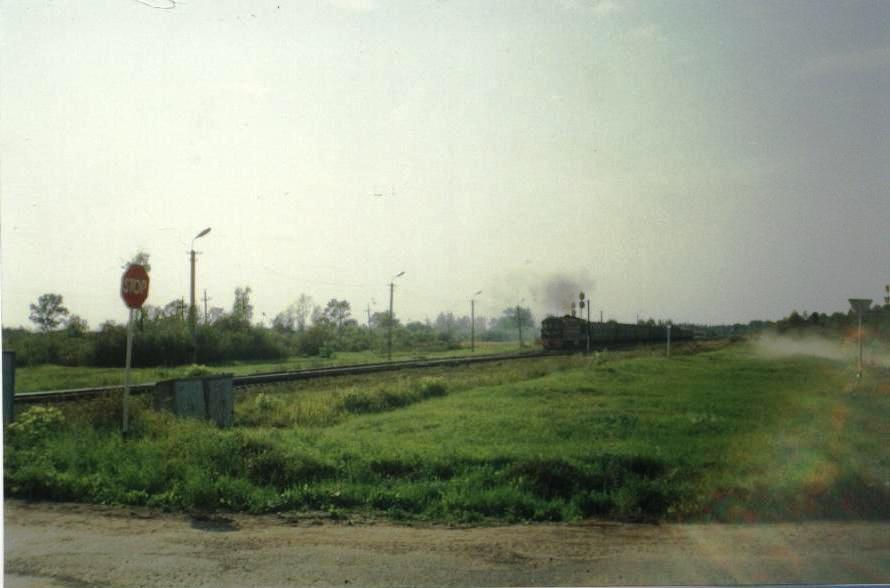 Локомотив ТЭП70 с поездом 6501 "Великие Луки - Посинь" проследовал входной светофор станции Маево. Фото конца 90-х годов