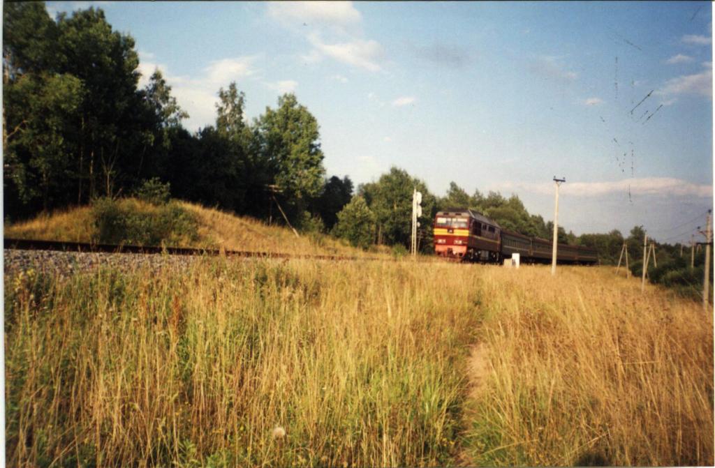 Локомотив ТЭП60 с поездом 6502 "Посинь - Великие Луки" отправился со станции Маево. 2000 год.