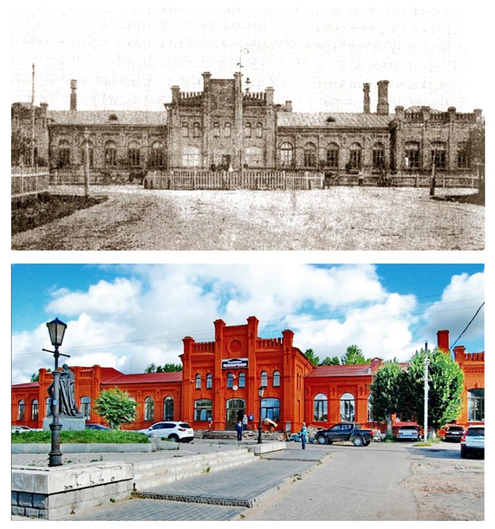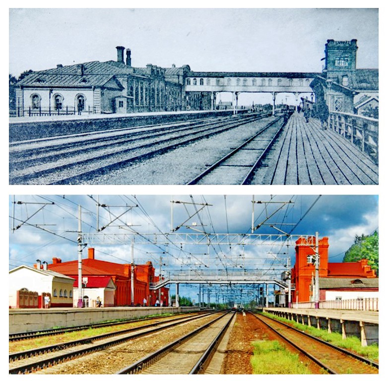 ЖД вокзал Вышнего Волочка в начале 20 века и 100 лет спустя - вид со стороны привокзальной площади.