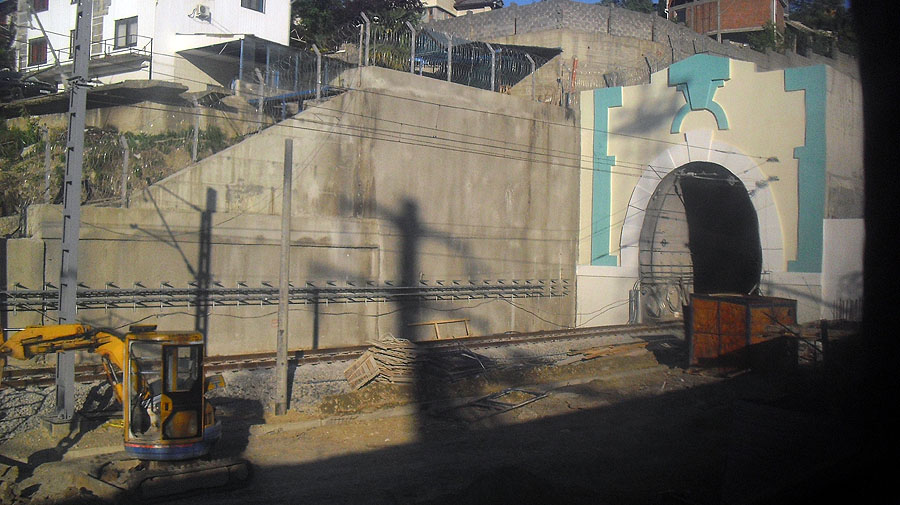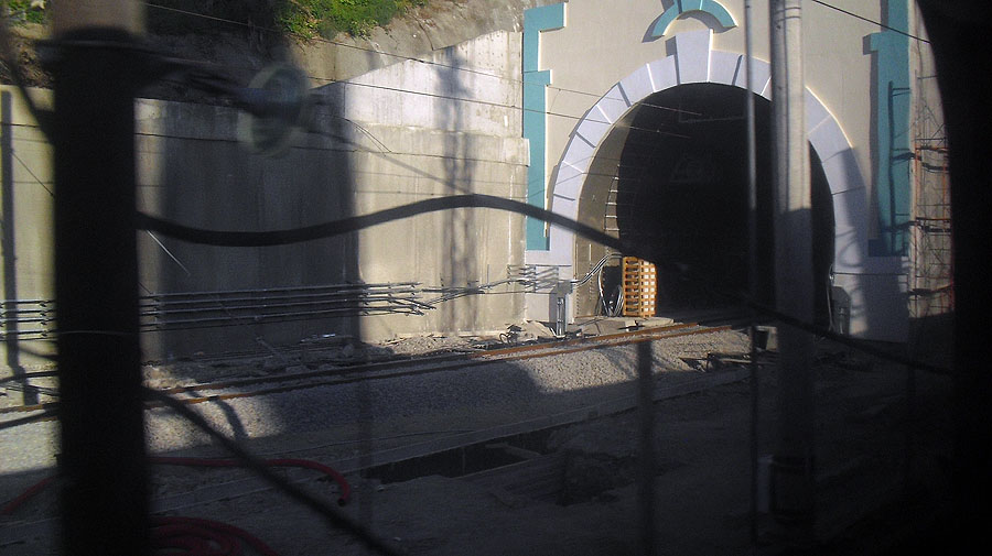 Абсолютно точно, Альберт. Специально смотрел этот участок. Путь уже лежит. Свежий щебень. Много разной техники. Вот, пожалуй, ещё несколько снимков. Южные порталы обеих Сочинских тоннелей. Съемка велась с правой стороны по ходу поезда, в сторону Адлера. Т.е. мы шли как бы "по неправильному" пути. Работают в основном службы ЭЧ, СЦБ и др. Ощущение, что в ближайшее мега окно (то, что будет в середине мая) сплошной второй путь сдадут в эксплуатацию.Альберт К:Сергей ты уверен? После седьмого тоннеля в районе стадиона Метревели до Мацесты настолько узкое место,serg33:Вкрации расскажу об увиденном на ЧПК 9 мая 2013г.