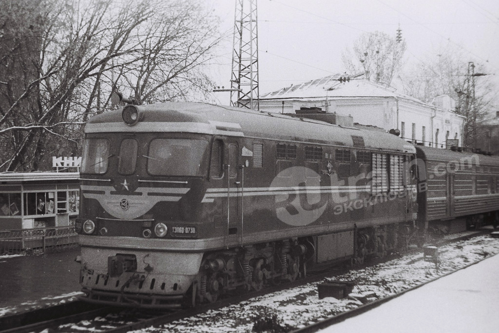 Тепловоз ТЭП60-0738 с пассажирским поездом на станции Ожерелье, Московская область (фото сделано в октябре 1984 года):