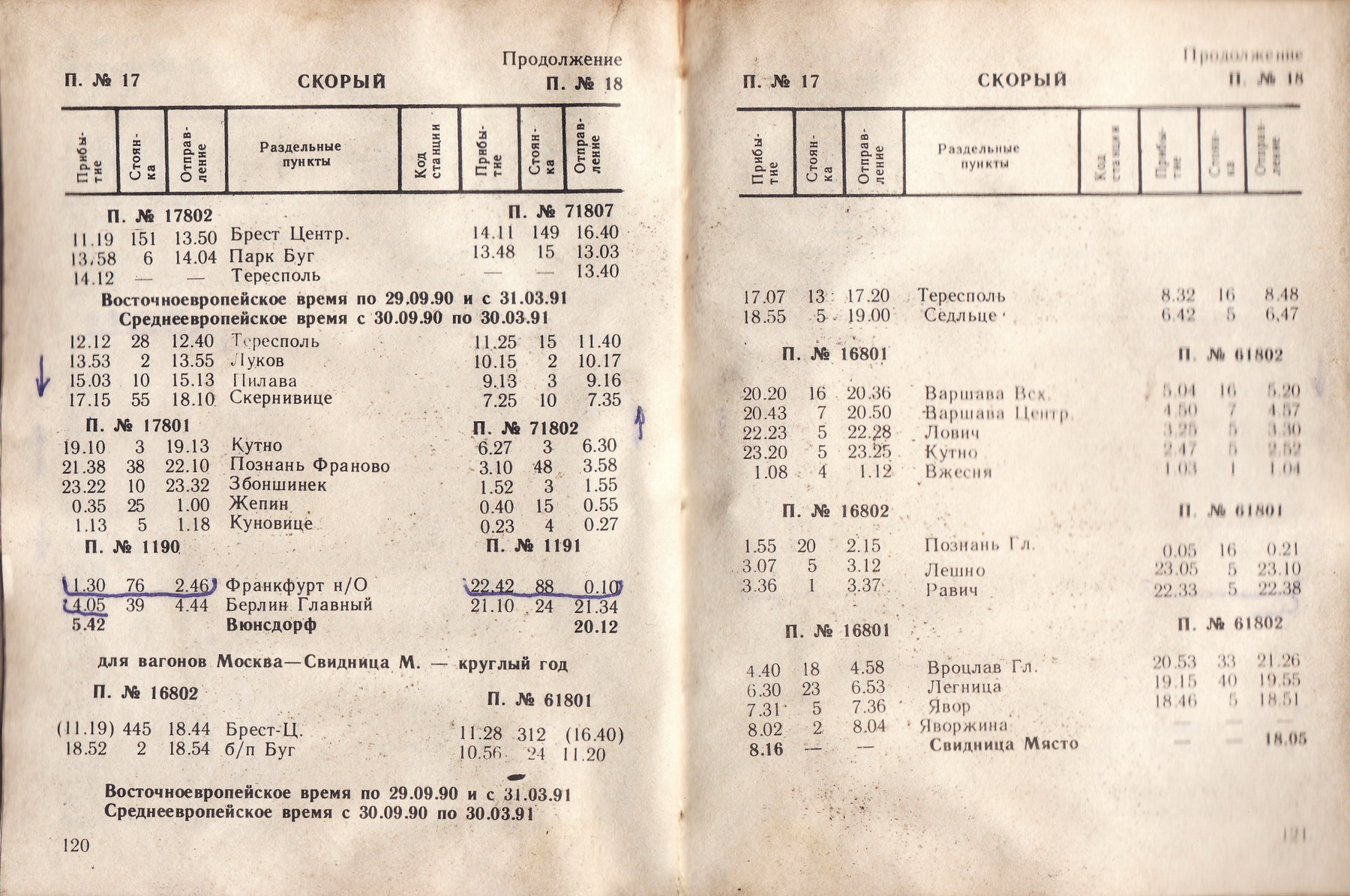 SM@TRON: Подробное расписание поезда № 17-18 «Москва – Вюнсдорф» из служебки БЕЛ ЖД за 1990-1991 годы: