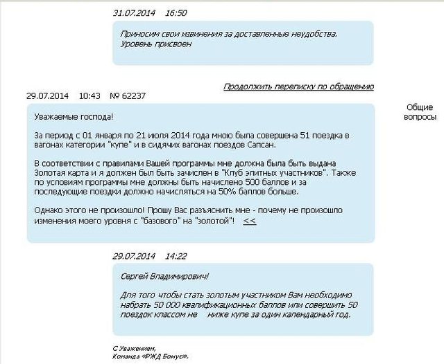 Знаете, вот я написал ведь именно об этом в своём вчерашнем сообщении, а мне почему-то до сих пор на мои два простых (для "постоянных пользователей" РЖД) вопроса никто не ответил. Серж, неужели Вы не знаете ответа ни на один вопрос ? Раз в два года нужно в купе совершать поездку, или же "Сапсаны" или нефирменная сидячка тоже подойдут ? Я просто очень редко в купе езжу, поэтому такой вопрос и возник.serg: баллы РЖД_бонуса аннулируются ровно через два года после совершения последней поездки, если после нее поездок не было.