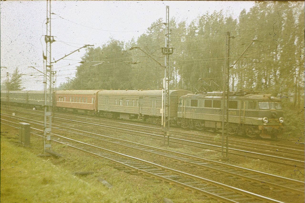 Pro publico bono, sorry za nie najlepszą jakość slajdów, niestety schrzanionych przez zakład usługowy w latach 80. Na początek linia średnicowa rok 1988: EU07-105 ze składek ruskich "stodół"; ciekawostką jest tutaj wagon restauracyjny SZD.
