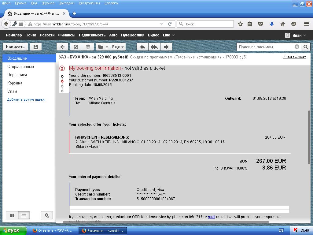 Когда продают билеты через сайт, приходит в теле письма вот такое подтверждение. Потом нужно было выбрать как получать билет в автомате или самому распечатать. Можно написать на электронную почту и они Вам пришлют форму для заказа билета с пересылкой по почте туда куда скажете, стоило 5 Евро в 2013 году. Таким же образом можно купить билет из Варшавы в Вену. Деньги сразу списывают.