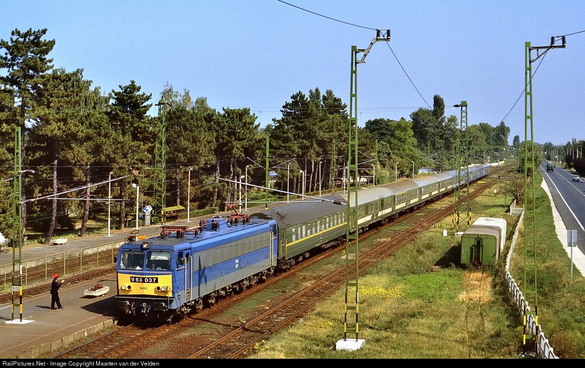 Электровоз MAV V63 037 с поездом № 202 "Agram" сообщением Мишкольц - Загреб и прицепным вагоном SZD Москва - Загреб на станции Балатонфеньвеш, Венгрия (17 сентября 1992 года):