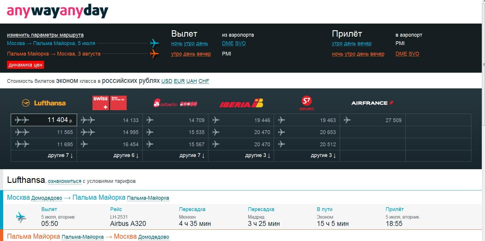 Цена авиабилета Москва-Майорка-Москва (даты первые попавшиеся: 05 июля - 03 августа)