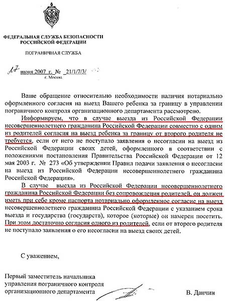 По поводу согласия от второго родителя - оно 100% не требуется во всех случаях, едет ли ребёнок (гражданин России) вообще без родителей или только с одним из родителей. Более того, на практике пограничники как с российской, так и с украинской стороны про него и не заикаются. А все эти слухи, которое продолжают циркулировать о необходимости согласия от второго родителя, идут от нотариусов и от неправильного толкования закона «О порядке выезда из РФ и въезда в РФ», в котором фраза "...согласие указанных лиц..." может трактоваться как необходимость наличия согласия от обоих родителей, т.к. слово "лиц" дано во множественном числе. Но на этот счёт имеется письмо пограничной службы с разъяснением, что согласие от второго родителя не требуется.