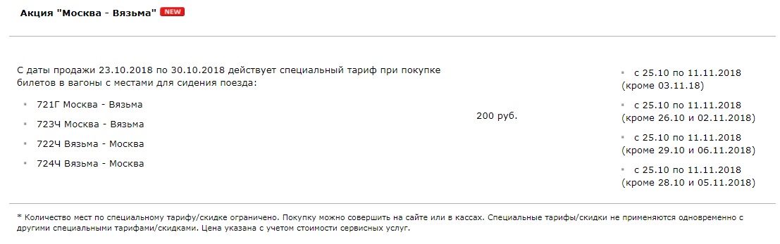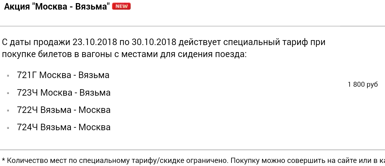 Разработчики акции, видимо, предполагают, что жители Смоленска с нетерпением ждали возможности доехать до Москвы за такие деньги в купе на верхней полке - ехать на Ласточке за меньшие деньги несерьезно... Ну и до кучи - мечтающему о такой поездке придется взять отгул на один день до праздников и один день после, так как 02 и 06 ноября рабочие дни.