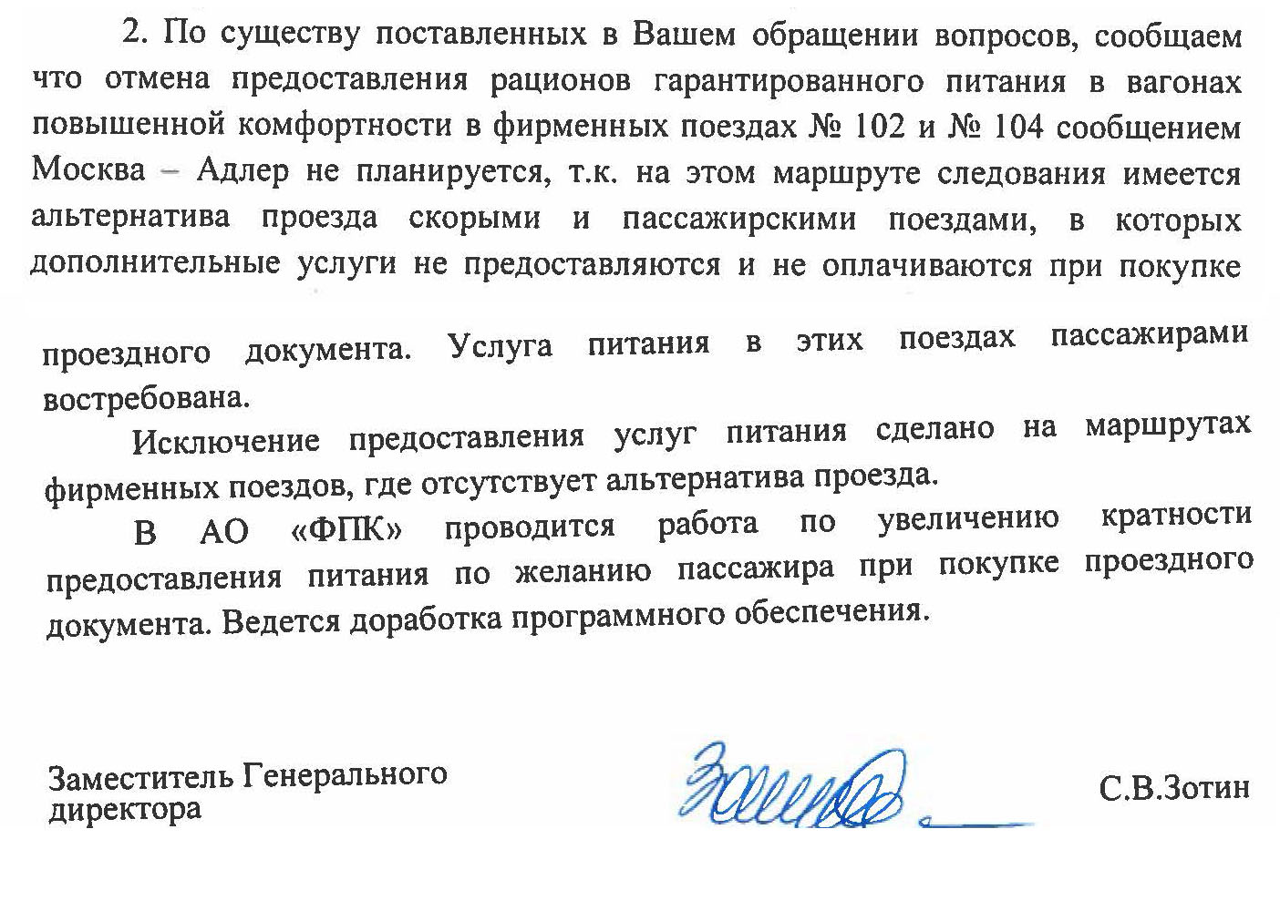 Известно, что год назад на встрече с пассажирами Иванов публично объявил, что навязывание услуги питания в поездах будет отменено. Также в ответах на мои личные обращения неоднократно сообщалось, что "прорабатывается возможность при оформлении билета предоставления возможности выбора количества рационов предоплаченного питания, а также отказа него". Однако до сих пор (спустя от уже год) этого сделано так и не было. На мои повторные обращения с прямо поставленным вопросом "почему до сих пор ранее заявленное не сделано, и когда же это будет сделано?" приходили лишь бестолковые отписки.