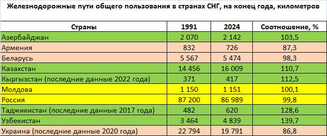 Понятно, что потоки (грузовые и пассажирские) меняются со временем, что-то открывается, что-то закрывается. Баланс может быть как положительным, так и отрицательным. Но с развитием или деградацией сети ее общий километраж никак не связан.