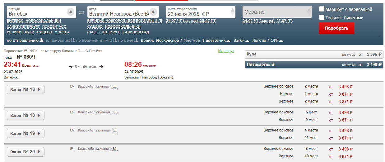 bu906:Псков-ВН не показатель. Новосокольники-Мурманск пробегись. Там даже на в ночь на четверг сметено всё. И через неделю тоже. А там до 6 вагонов (4ПЛ + 2К) группа.