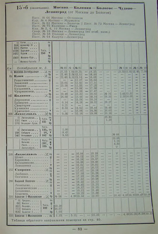 Wowan:Спрашиваете — отвечаем. 1961 год (тепловозная тяга!). Обратите внимание на график курьерских поездов №4 (Москва — Мурманск) .