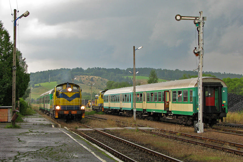 Krzyżowanie opóźnionego 180 minut pociągu 7930 rel. Hirov - Sanok, ze składem zastępczym pociągu 7923 rel. Sanok - Hirov po prawej (26.07.2008).