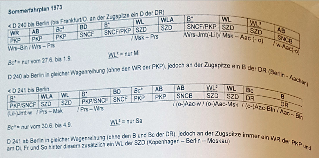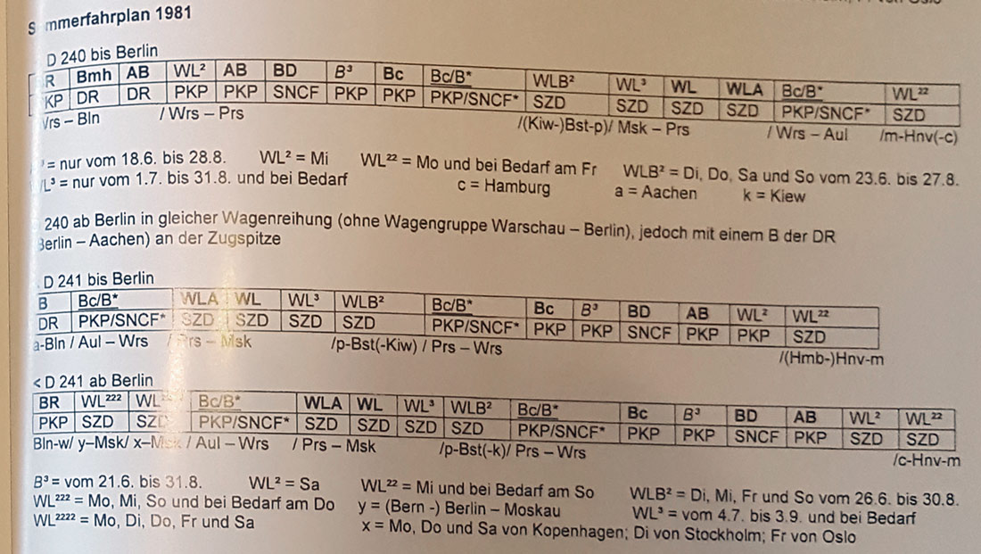 Mam jeszcze foty książki Ricco Boguli "Internationale Schnellzuge in der DDR" (ktoś z użytkowników rosyjskojęzycznego forum 'zapodał' - nie potrafię teraz znaleźć źródłowej strony) z zestawieniami Ost-Westa: lato 1973, zima 1973-74, lato 1979, zima 1979-80, lato 1981 i zima 1981-82.