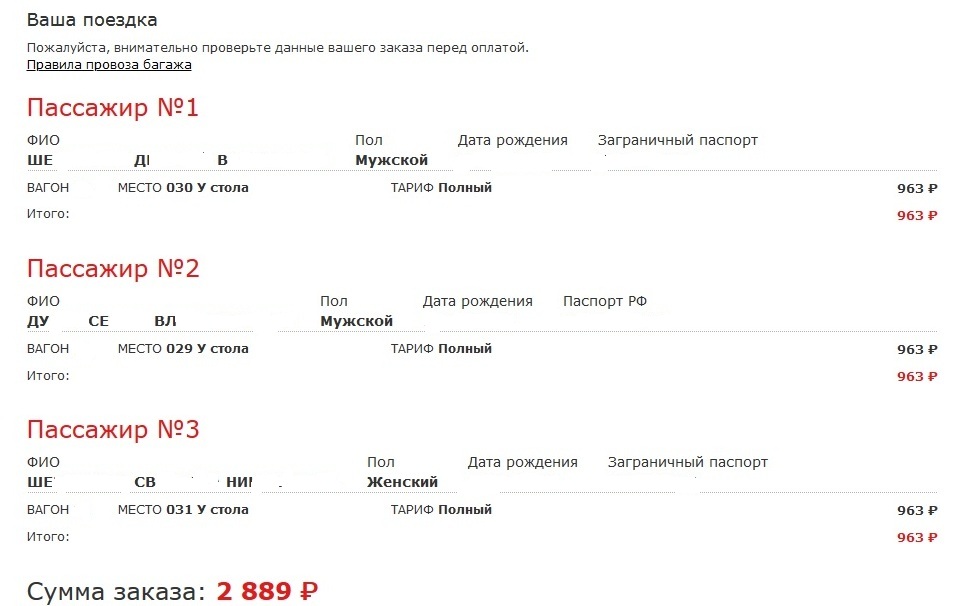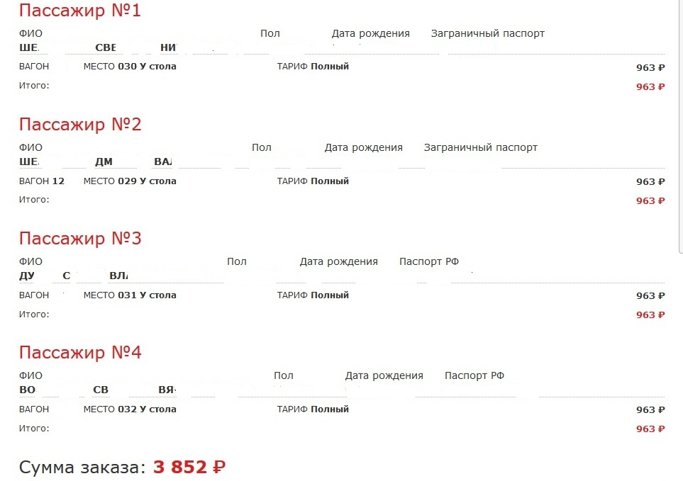 Как и обещал - высылаю распределение мест по номерам среди пассажиров. Как ни старался - закономерности не уловил. Для нас это было неактуально - все места по взрослому тарифу. Оставил первые буквы ФИО пассажиров.serg: Сегодня покупал билеты на Стриж - ощущение, что сортирует введенных пассажиров и распределяет их в рамках границы выделенных мест по датчику случайных чисел. Будет время - выложу скрины...