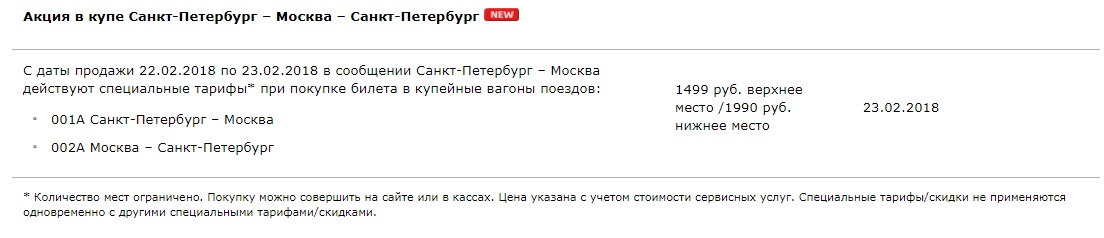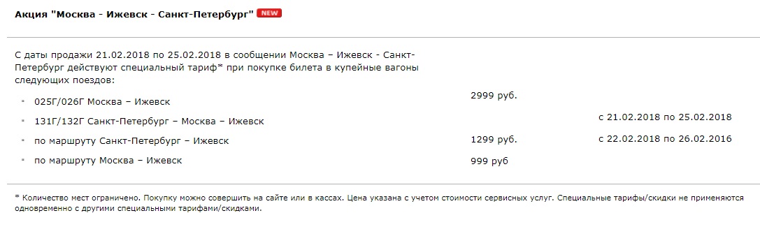 С даты продажи 21.02.2018 по 28.02.2018 при покупке билетов на верхние места купейных вагонов поездов АО "ФПК" (перечень поездов) действует скидка 70%.