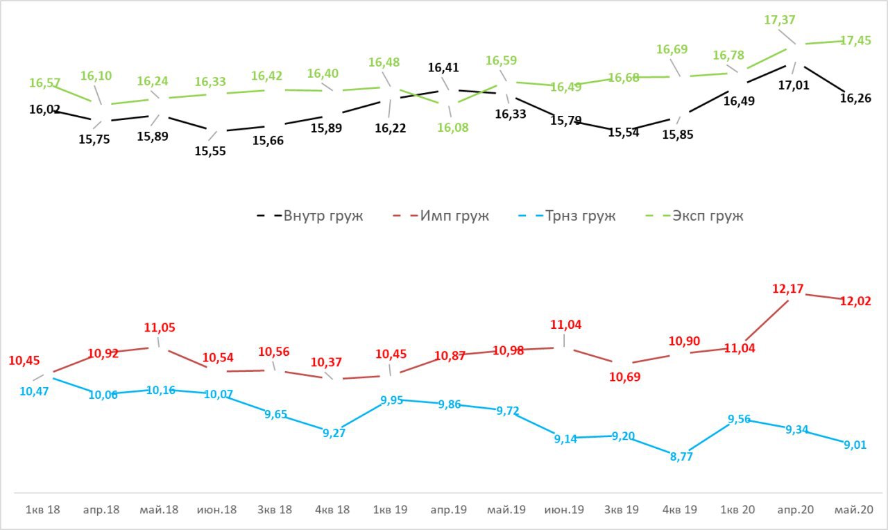 Очень мощно прибавил средний вес импотного контейнера за последние 2,5 года - плюс 1,5 тонны. Падает только загрузка транзита. Это хороший знак. Более честное оформление, более дорогие товары.